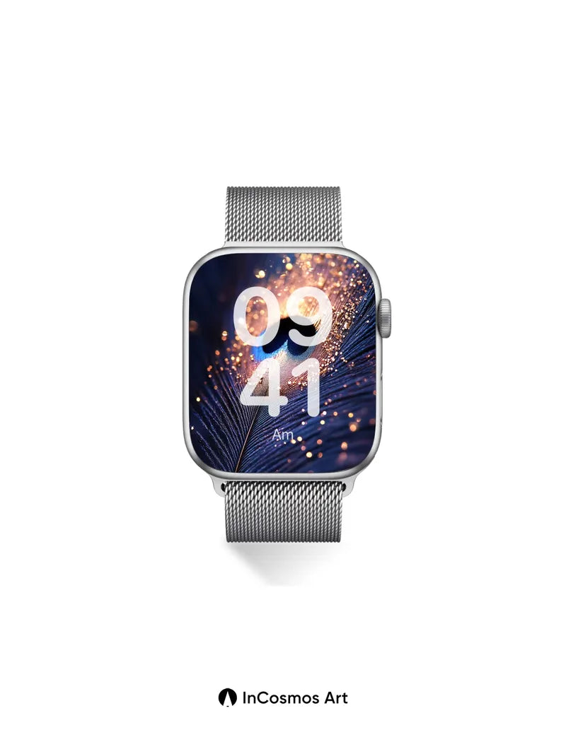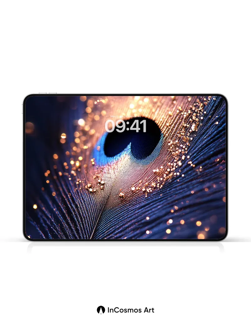 Debug page_description: Did you know peacock feathers reflect light through microscopic structures, creating iridescent hues without pigment? Here, each barb glows like a constellation, dusted with golden particles that shimmer as if breathing in the dark. The eye of the feather pulses with deep indigo and electric blue, surrounded by a halo of warm sparks that dance across the surface like stardust caught in time. Share this with your best friend. Send this to your love and swap a matching set. What if every glance at your wall could spark a memory of midnight magic?