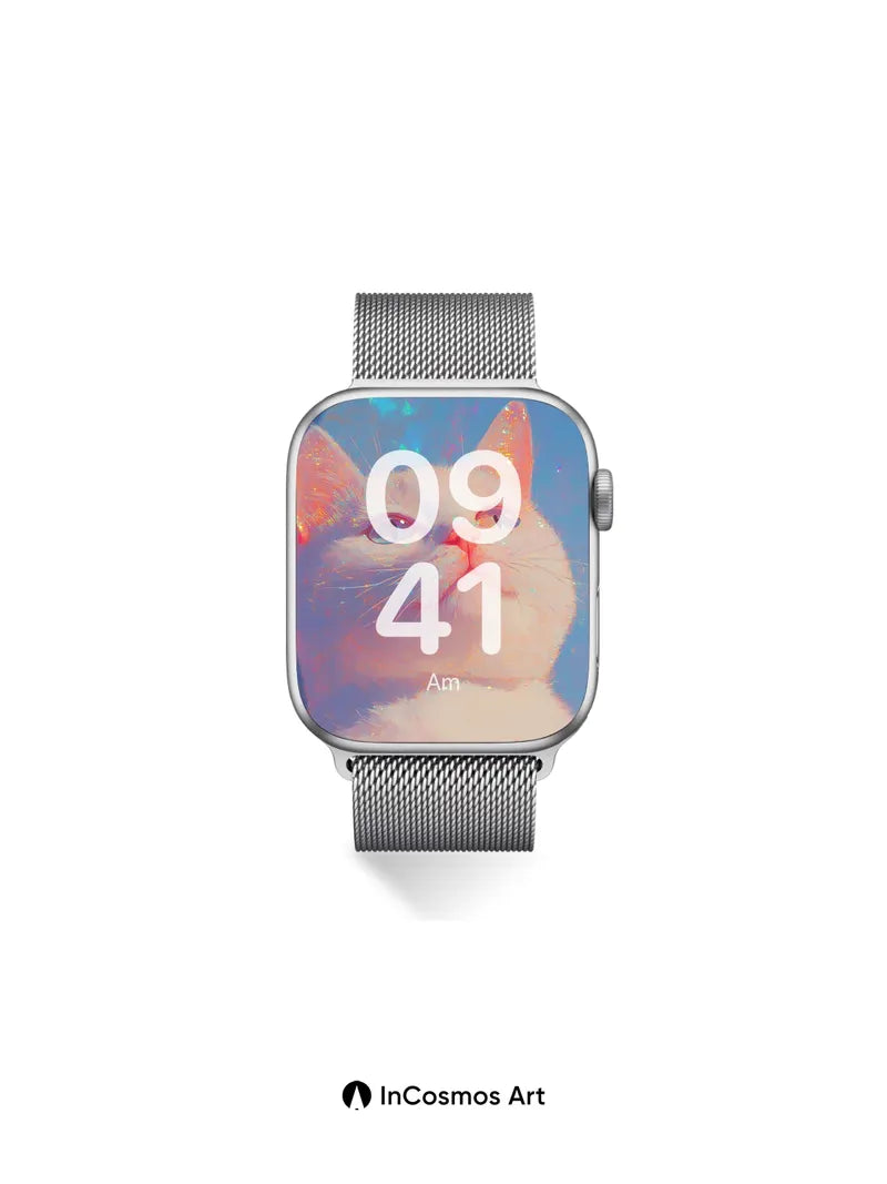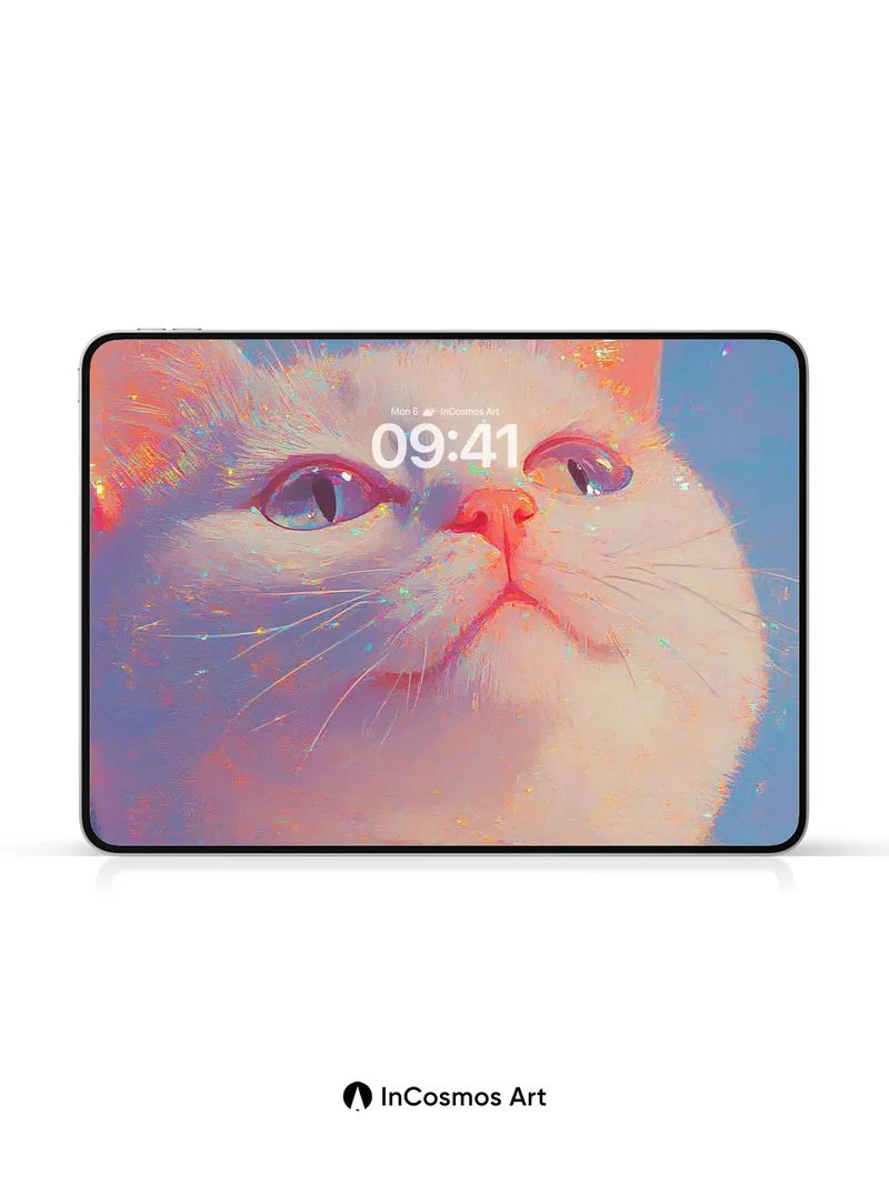 Debug page_description: Did you know that cat whiskers can detect changes in air pressure, like tiny antennae tuned to the unseen? Here, a soft white fur coat shimmers with iridescent particles as if stardust has settled into every hair, and light dances across its face like liquid auroras. The sky behind blurs into a dream of electric blues and prismatic flares, where reality feels thin and breathable. Share this with your best friend. Send this to your love and swap a matching set. What if your pet could see the universe inside you?