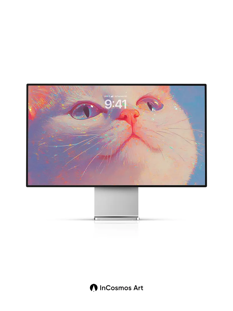 Debug product.metafields.custom.desc: Did you know that cat whiskers can detect changes in air pressure, like tiny antennae tuned to the unseen? Here, a soft white fur coat shimmers with iridescent particles as if stardust has settled into every hair, and light dances across its face like liquid auroras. The sky behind blurs into a dream of electric blues and prismatic flares, where reality feels thin and breathable.