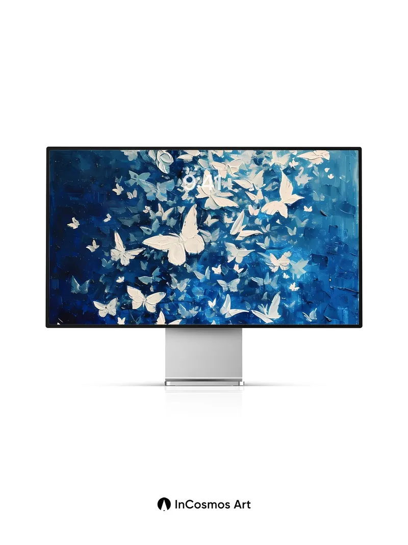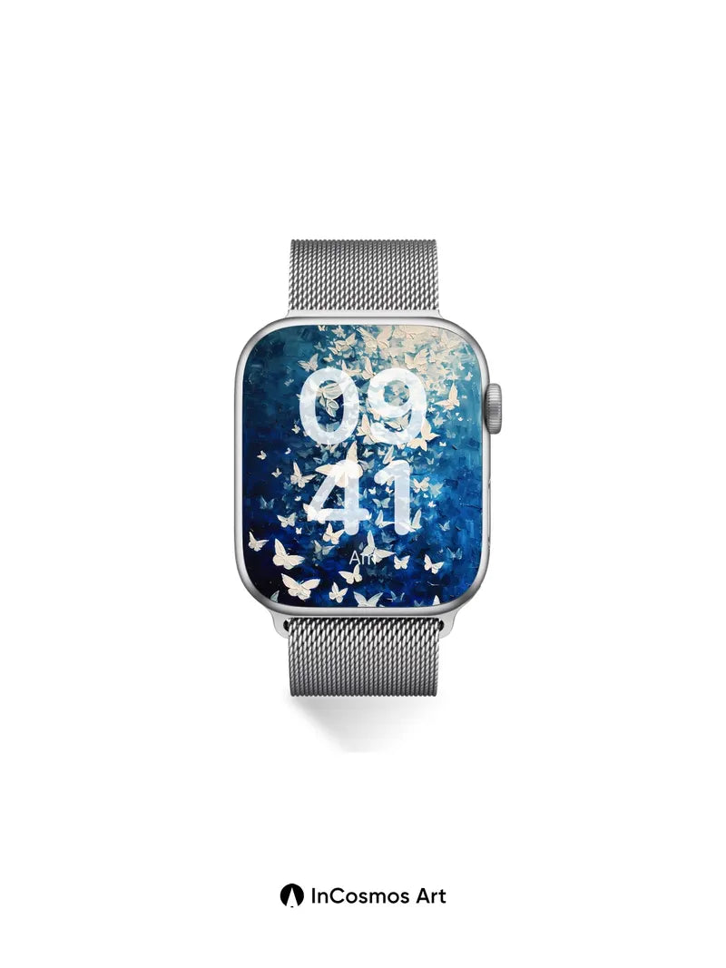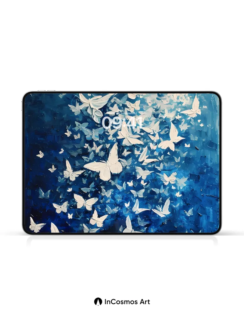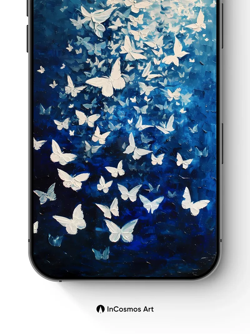 Debug page_description: Did you know that butterfly wings are covered in microscopic scales that refract light like tiny prisms? In this artwork, each white wing glows against a deep indigo void, as if illuminated from within by moonlight trapped in paint. The butterflies rise upward, their forms dissolving into soft haze at the top, where light bleeds into silver and the sky feels alive with quiet motion. Share this with your best friend. Send this to your love and swap a matching set. What if every flutter was a memory returning?