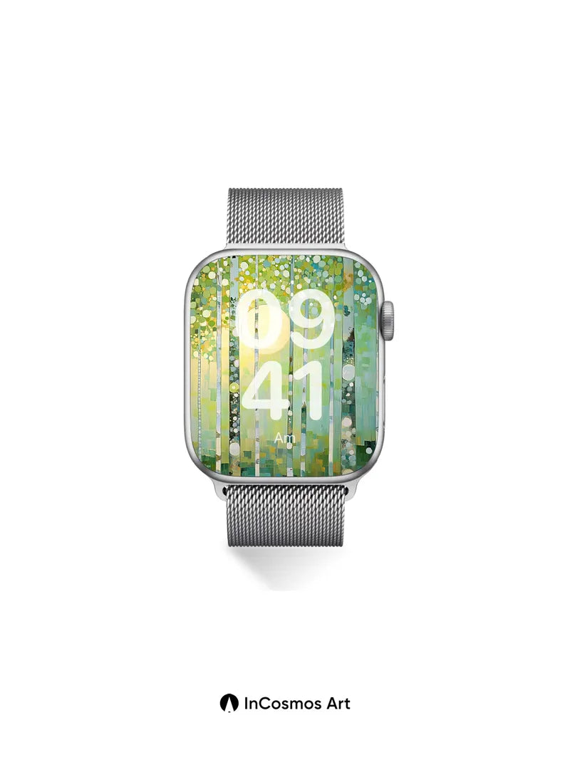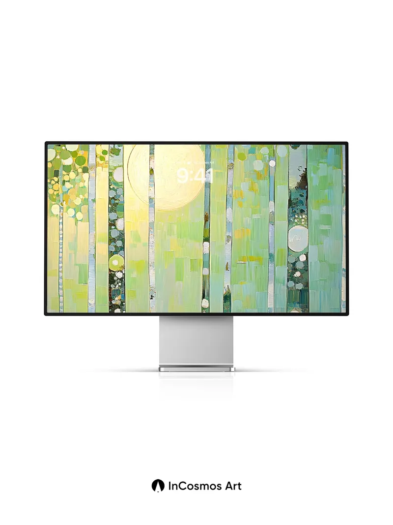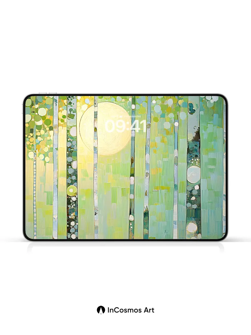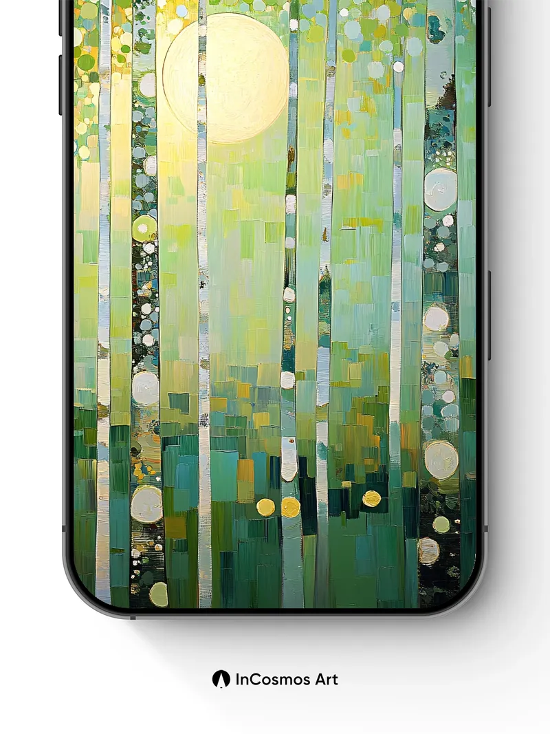 Debug product.metafields.custom.desc: Did you know sunlight filters through birch canopies in a way that mimics stained glass, casting mosaic patterns on the forest floor? Here, light breathes through vertical trunks like liquid jade, each dot of foliage pulsing with chlorophyll-rich energy. The trees stand tall and silent, their bark etched in silver veins, while golden orbs float upward like whispered secrets.