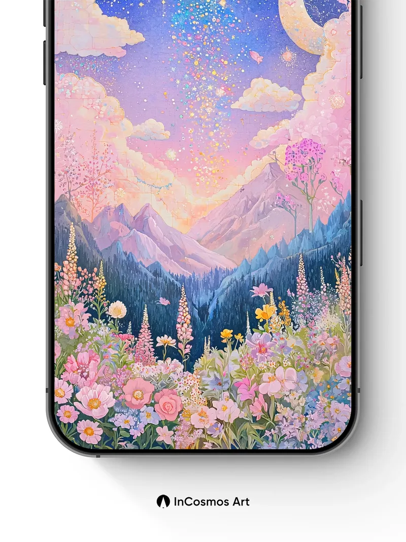 Did you know that in ancient folklore, the moon’s glow could awaken flowers at midnight? Here, a golden full moon spills stardust like liquid light over a valley where cherry blossoms and wildflowers pulse with inner radiance. The sky bleeds into pastel clouds, while a crescent moon watches from the edge of dreams—this is not just scenery, but a living breath of night.