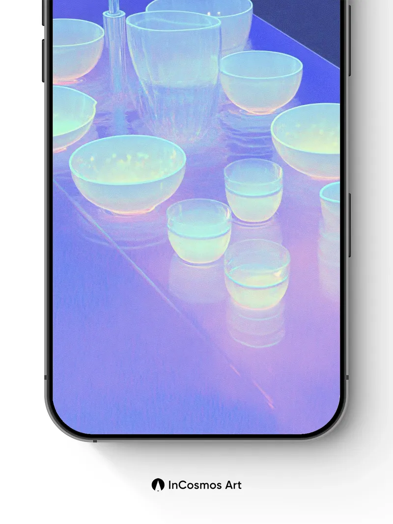 Debug product.metafields.custom.desc: Did you know light can refract through translucent glass like a quiet symphony? Each bowl and cup glows with a soft inner radiance, as if holding liquid moonlight in its curved embrace. The surface beneath them breathes with pastel gradients, where violet meets aqua in a slow dance of reflection. You’re not just seeing objects—you’re stepping into a moment suspended between dream and reality.