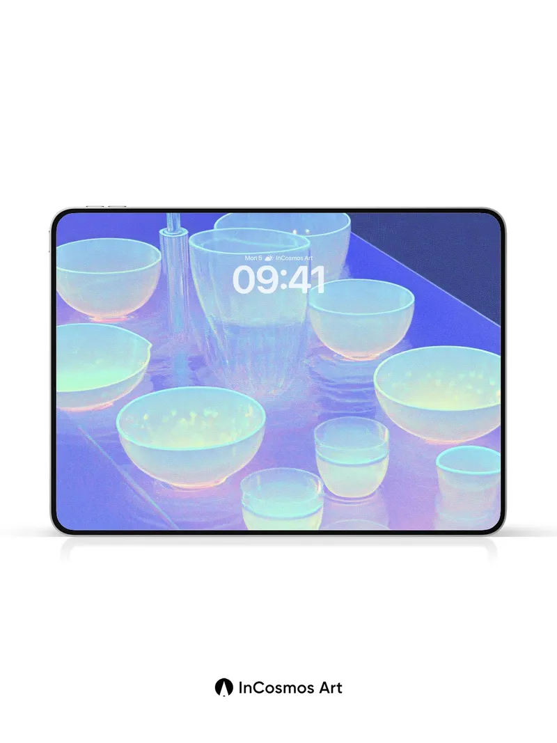 Did you know light can refract through translucent glass like a quiet symphony? Each bowl and cup glows with a soft inner radiance, as if holding liquid moonlight in its curved embrace. The surface beneath them breathes with pastel gradients, where violet meets aqua in a slow dance of reflection. You’re not just seeing objects—you’re stepping into a moment suspended between dream and reality.