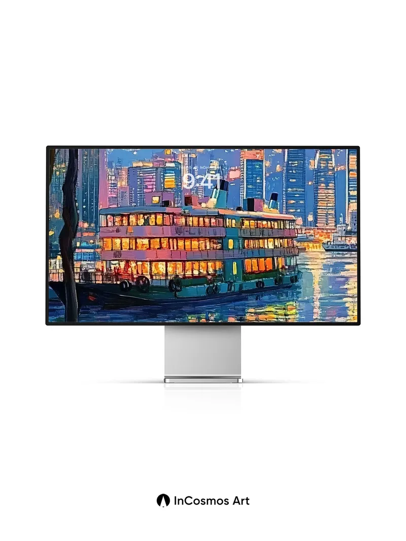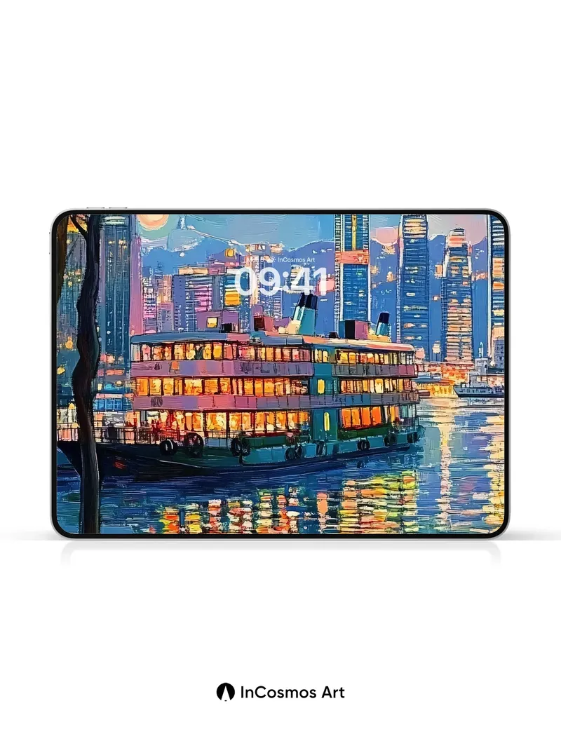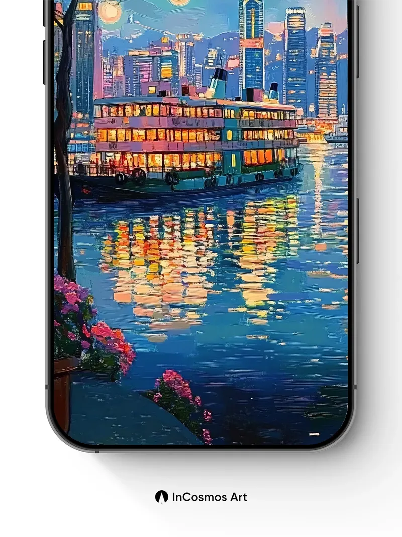 Debug product.metafields.custom.desc: Did you know the neon glow of city lights can refract like liquid gold across water at dusk? This scene pulses with warmth, where a vintage ferry glides beneath a canopy of glowing lanterns and flowering branches, its windows aglow with human stories. The skyline hums in electric blues and ambers, mirrored perfectly in the glassy river below—each ripple a whisper of motion in stillness.