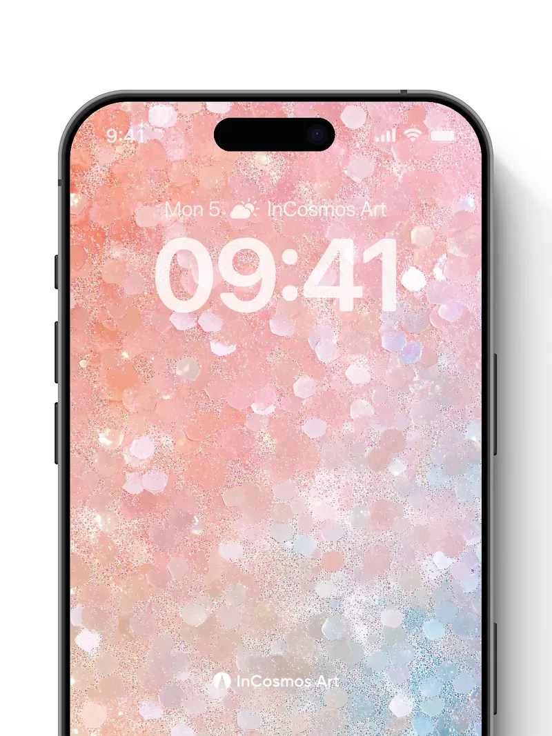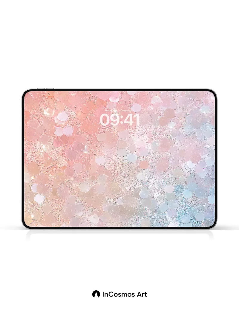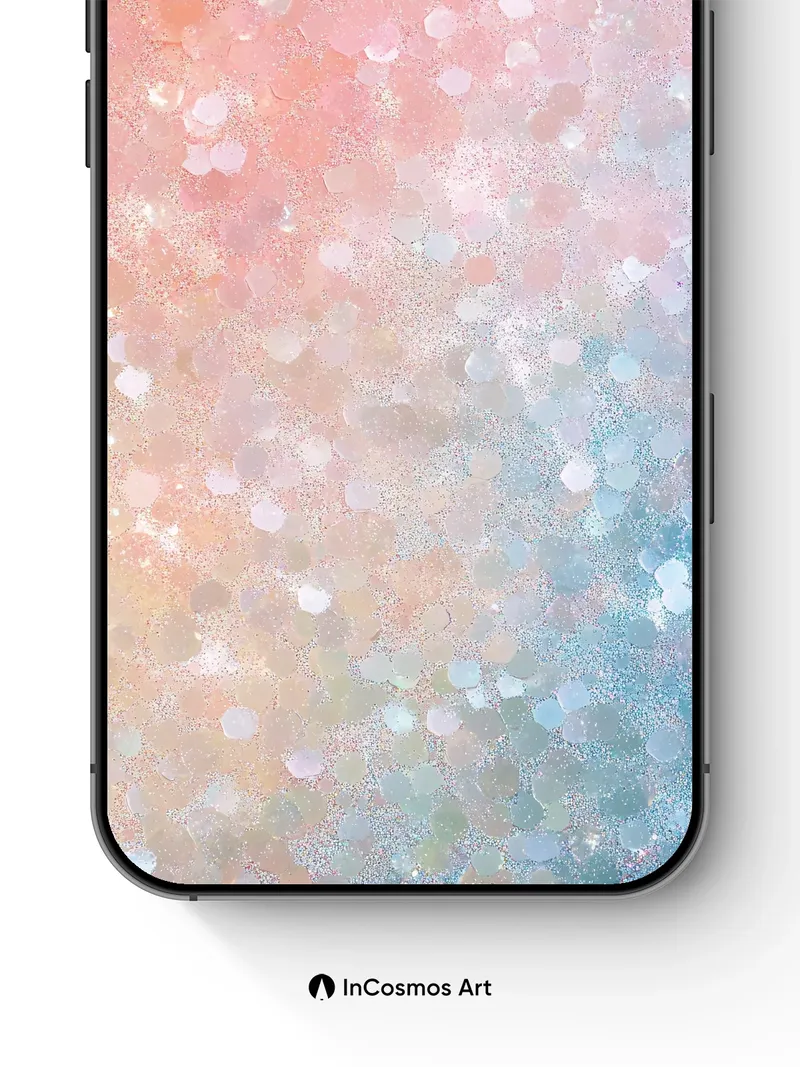 Debug page_description: Did you know that ancient Roman mosaics used tiny glass tesserae to capture light like prisms? This shimmering surface breathes with iridescent hexagons, each one a miniature galaxy of peach and aquamarine, softly shifting as if stirred by an invisible breeze. The texture feels alive—like sunlight crawling over wet silk, where every glance reveals a new hue beneath the sparkle. Share this with your best friend. Send this to your love and swap a matching set. What if your walls could remember the colors of a dream?