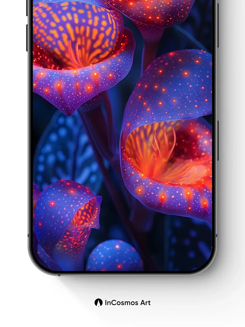 Debug product.metafields.custom.desc: Did you know that deep-sea creatures emit light to communicate in the dark? These flowers pulse like living stars, their violet skins speckled with crimson dots that shimmer as if breathing. Each bloom glows from within, revealing intricate golden veins that spiral toward a radiant core—like galaxies folded into petals. The darkness doesn’t swallow them; it cradles them, amplifying their otherworldly glow.