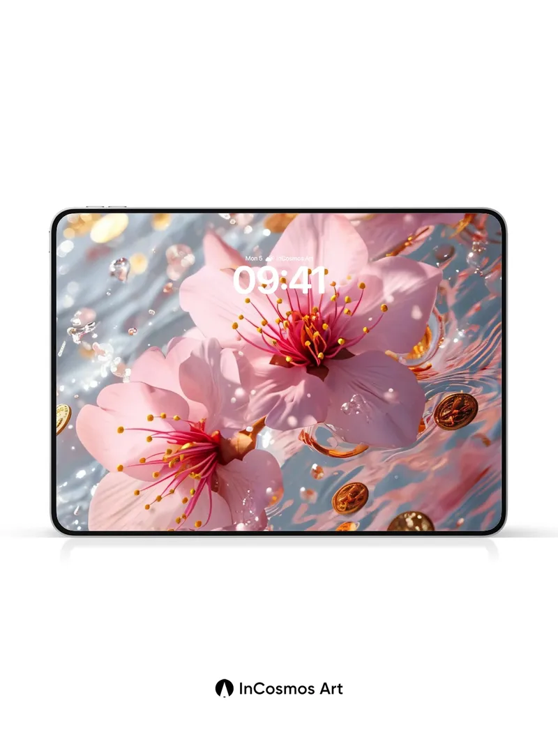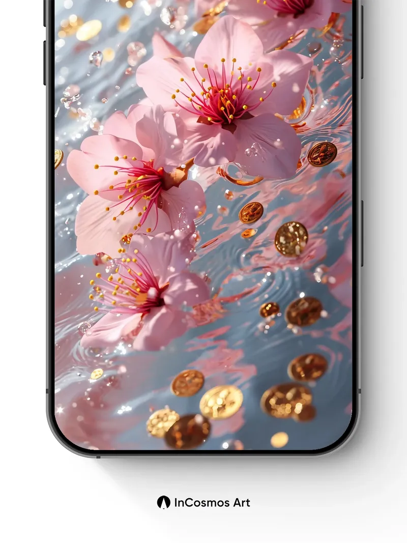 Debug page_description: Did you know cherry blossoms symbolize the fleeting nature of life in Japanese culture? Here, they drift like whispered secrets across water, each petal veined with rose-gold stamens and kissed by droplets that refract light into prismatic sparks. Beneath them, scattered gold coins shimmer like forgotten wishes, half-submerged in a liquid sky where reflection and reality blur into one breathless moment. Share this with your best friend. Send this to your love and swap a matching set. What if every drop held a memory waiting to rise?