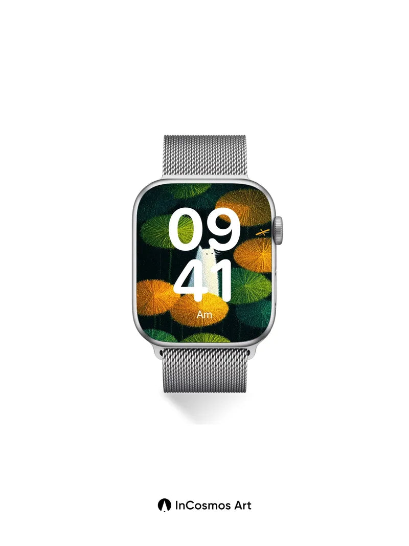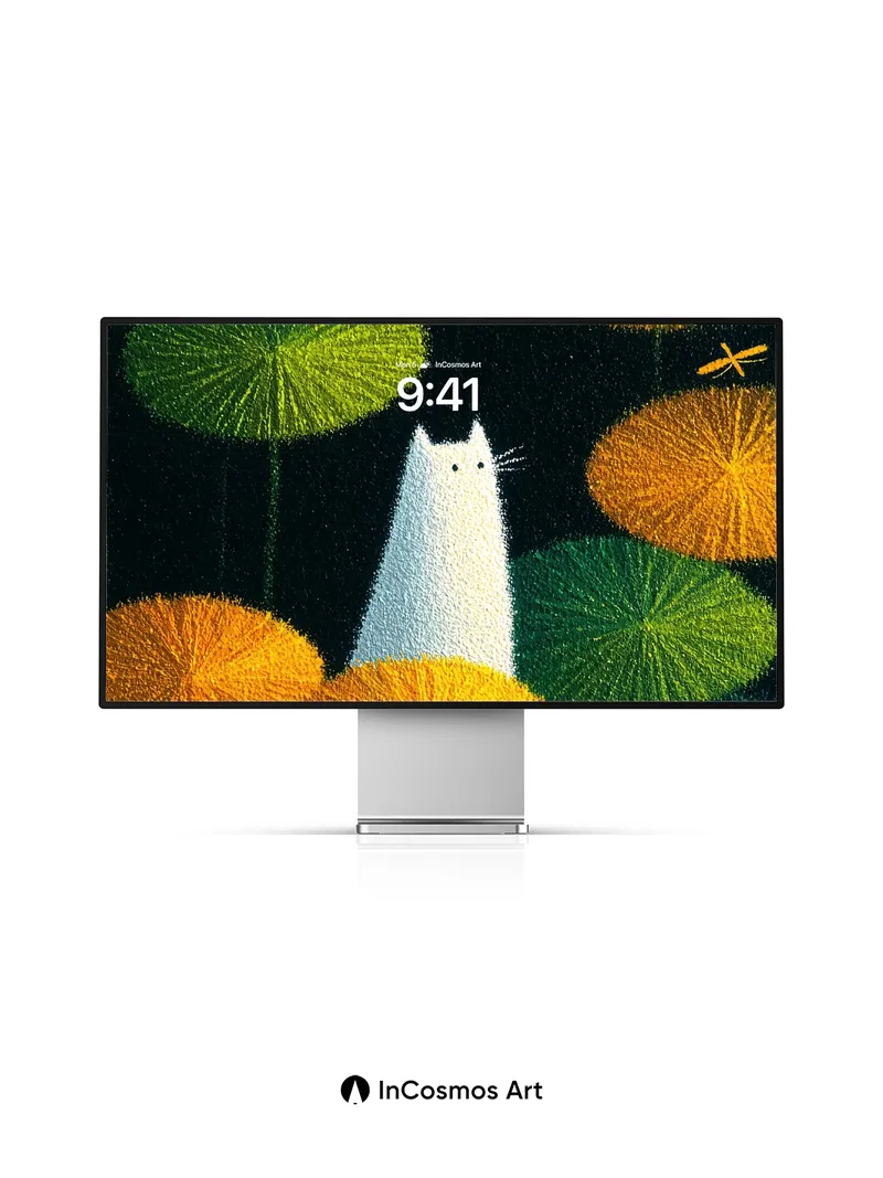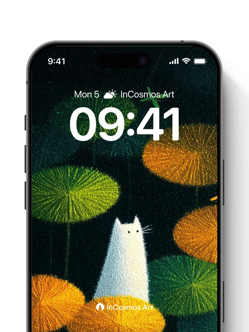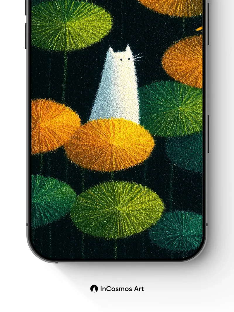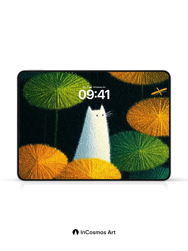 Debug product.metafields.custom.desc: Did you know that Japanese artists once used crushed seashells to create iridescent textures in their paintings? Here, light crawls over textured lily pads like silk spun from starlight, each one a radiant orb pulsing with quiet energy. A solitary white cat floats between them, its silhouette soft as mist, watching dragonflies dance across the dark water—time suspended in a dream of nature and wonder.