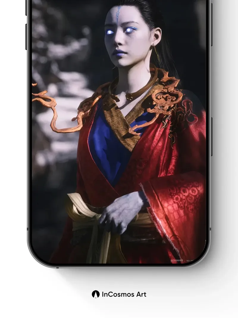 Did you know ancient Chinese artisans once dyed silk using crushed gemstones to achieve depth of color? Here, the fabric breathes like living flame, its crimson folds edged in molten gold, while a spectral serpent coils from the air, tracing patterns only seen in dreams. Her eyes pulse with starlight—cold and knowing—framing a face carved from moonlit stone, as if she’s stepped from a myth that never ended.