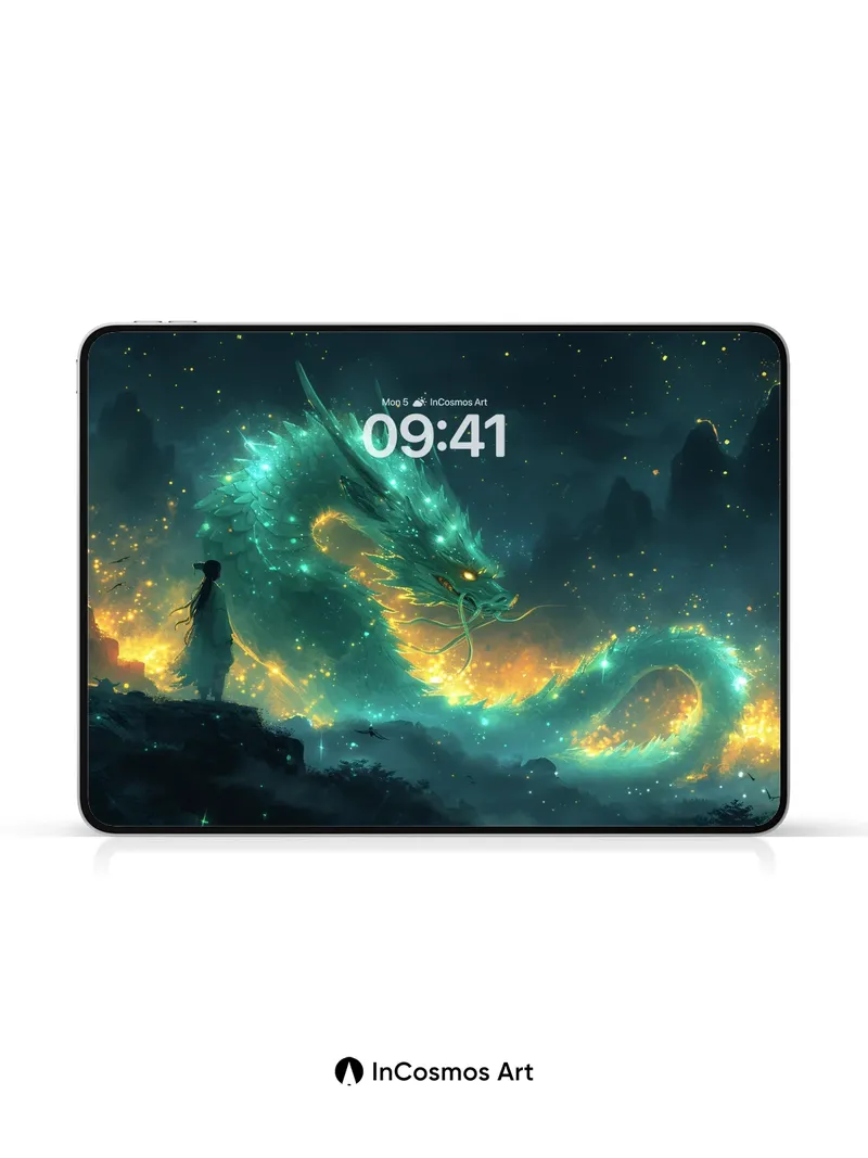 Debug page_description: Did you know ancient Chinese legends describe dragons as celestial beings born from mist and lightning? Here, emerald scales shimmer like liquid jade under a sky scattered with golden sparks, while the dragon’s breath weaves through mountain silhouettes like glowing silk. A lone figure stands in quiet reverence, dwarfed by the creature’s serpentine grace—its eyes aglow with distant stars. Share this with your best friend. Send this to your love and swap a matching set. What if every night, the stars woke up to breathe fire?