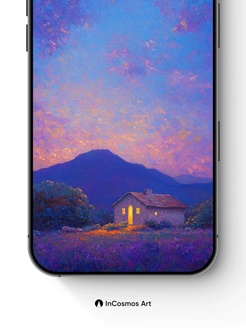 Debug page_description: Did you know the crescent moon casts a soft, ethereal light that can make shadows feel like whispers? In this scene, twilight bleeds into indigo as a single warm glow spills from a cottage’s window, painting the meadow in quiet gold. The sky hums with layered hues—lavender clouds drift like silk over distant peaks, while the earth breathes in violet and amber. Share this with your best friend. Send this to your love and swap a matching set. What if every night held a house just for you?