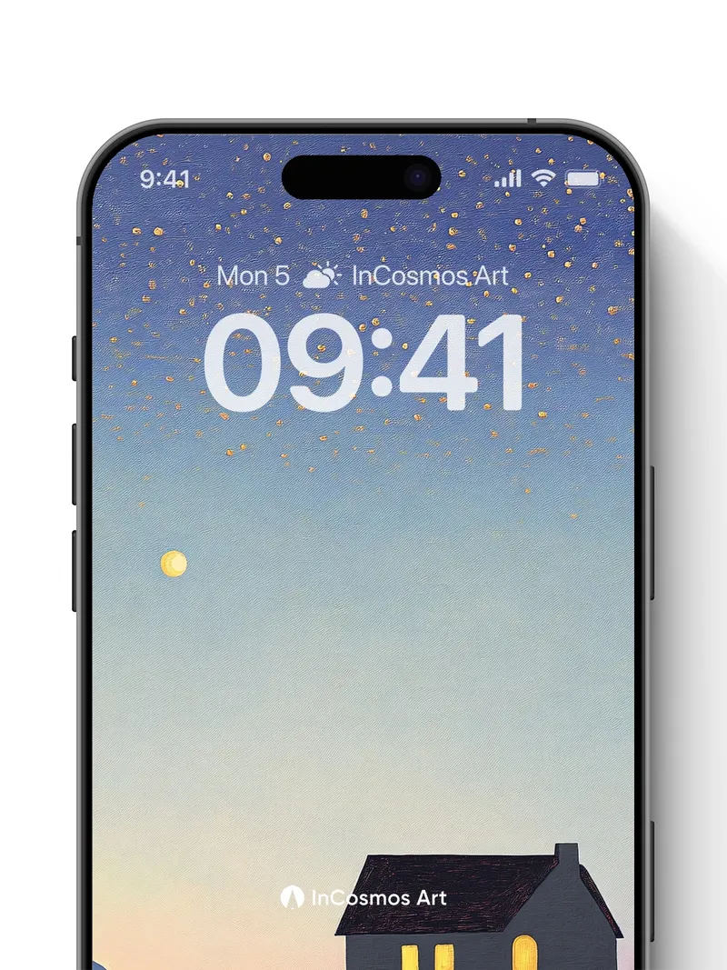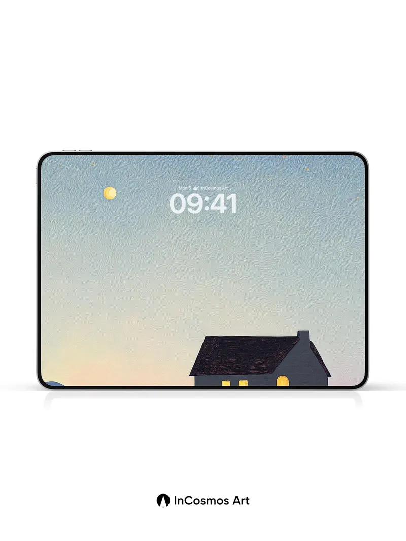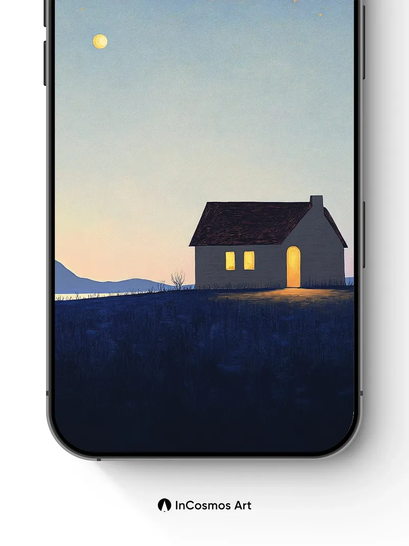 Debug product.metafields.custom.desc: Did you know the moon reflects 12% of sunlight, casting a soft glow that dances across still grass and warm windows? This quiet house breathes under a sky where golden specks drift like forgotten fireflies, each one a silent echo of distant stars. The light spills from the door like a promise, illuminating the hillside as if inviting you to step into a story written in twilight.