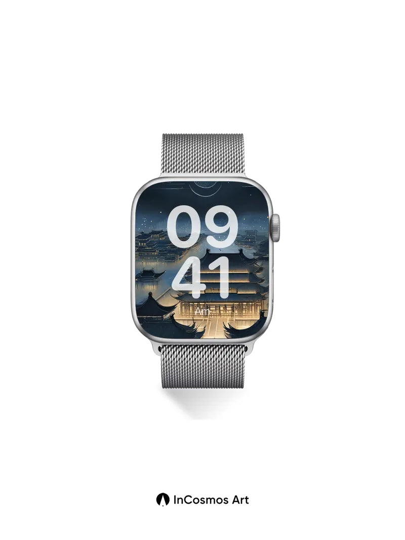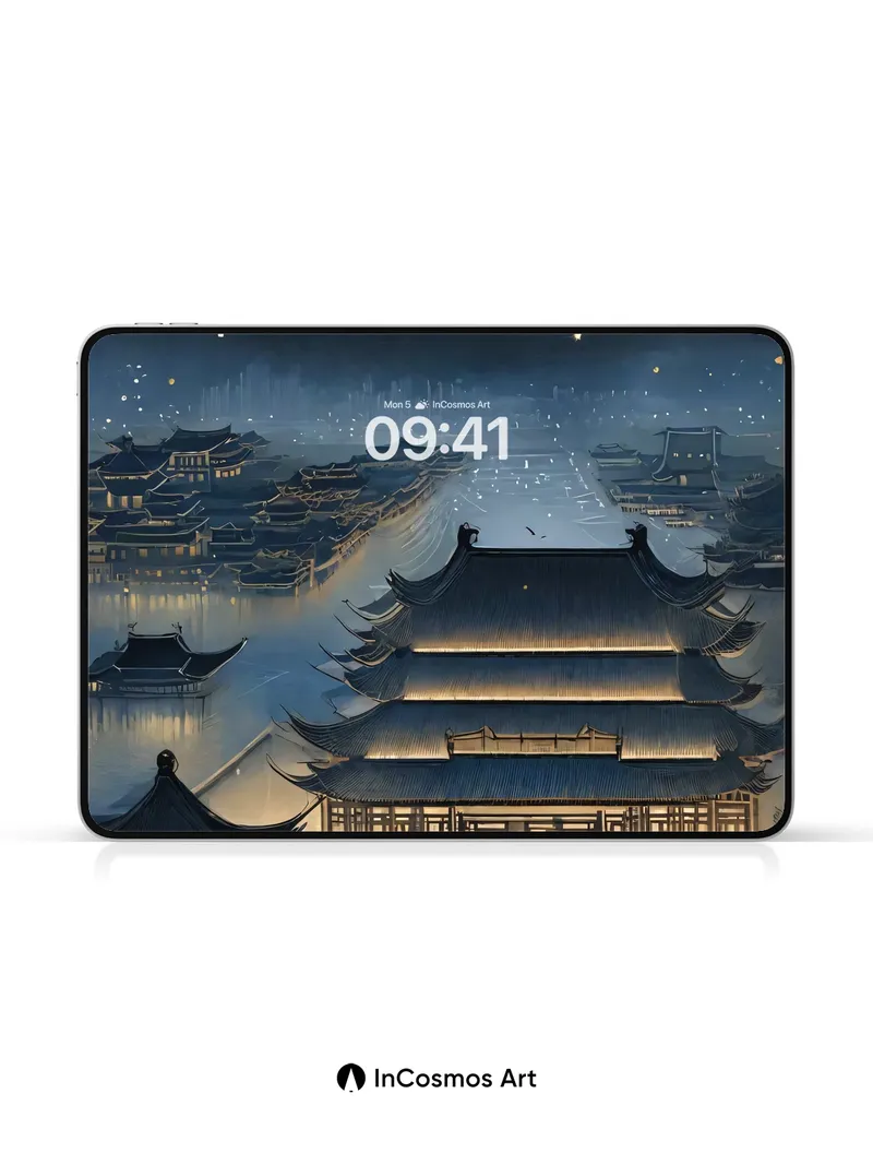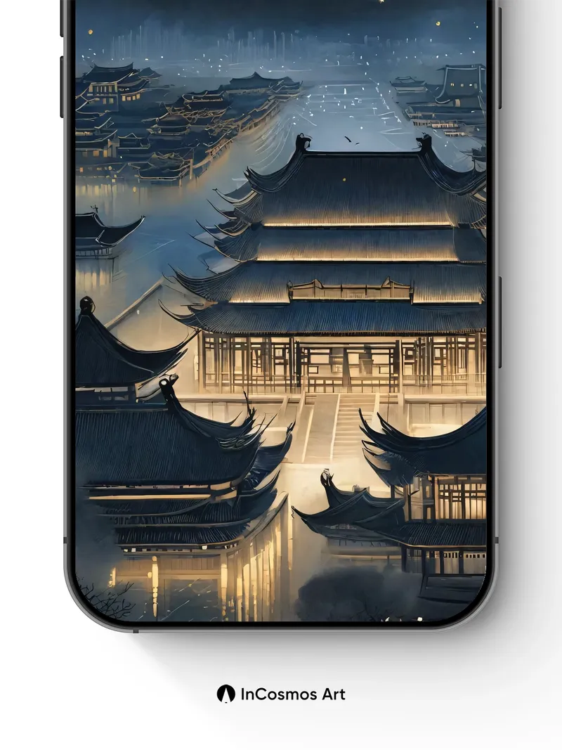 Debug product.metafields.custom.desc: Did you know that ancient Chinese architects aligned temples to celestial patterns, believing the moon’s glow could purify the soul? Under a fractured silver moon, ink-black rooftops rise like sleeping dragons over still water, their reflections trembling in the mist as if breathing. Light spills from paper lanterns, crawling across wooden beams and stone steps like liquid gold, weaving quiet magic into the night.