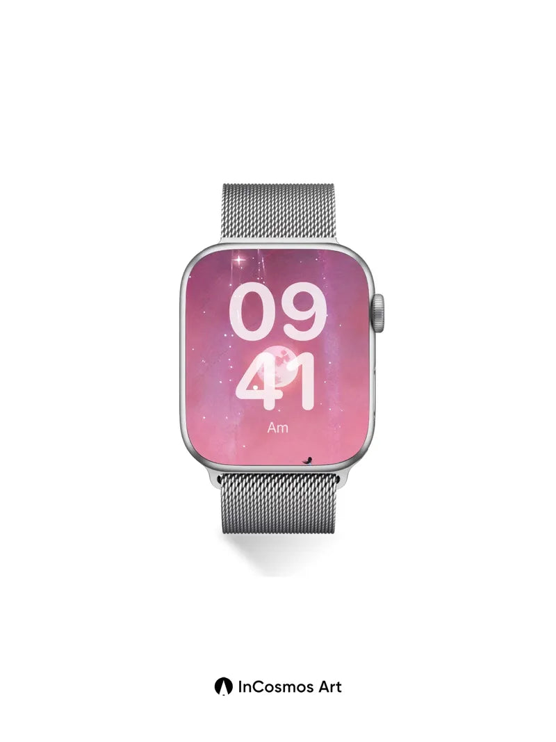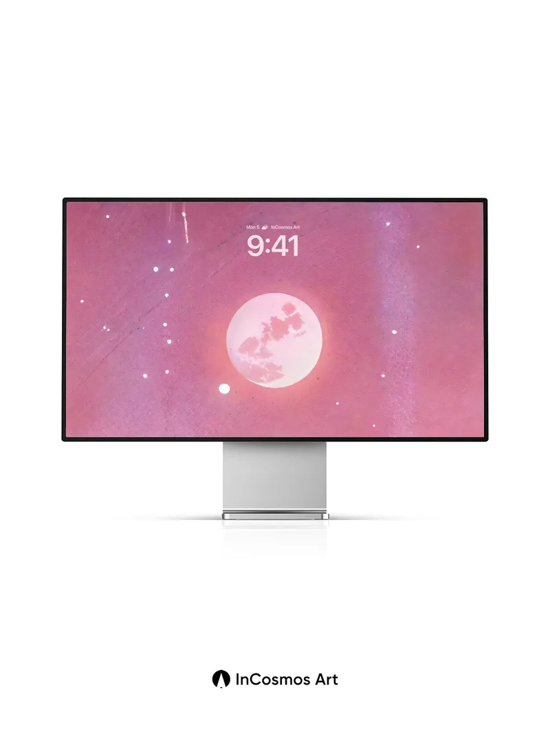 Debug product.metafields.custom.desc: Did you know the moon's surface is covered in a fine layer of glassy dust from ancient meteor impacts? In this scene, light breathes through a pink-hued sky like silk unraveling across the cosmos, while stars fall in slow motion, trailing luminous threads. A lone figure stands on a dark ridge, draped in fabric that floats as if pulled by unseen tides, gazing at a full moon veiled in faint cloud patterns—its glow softening the horizon into a dream.