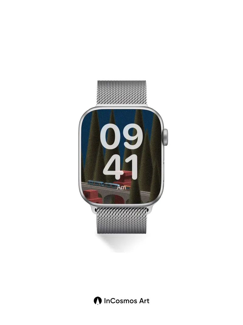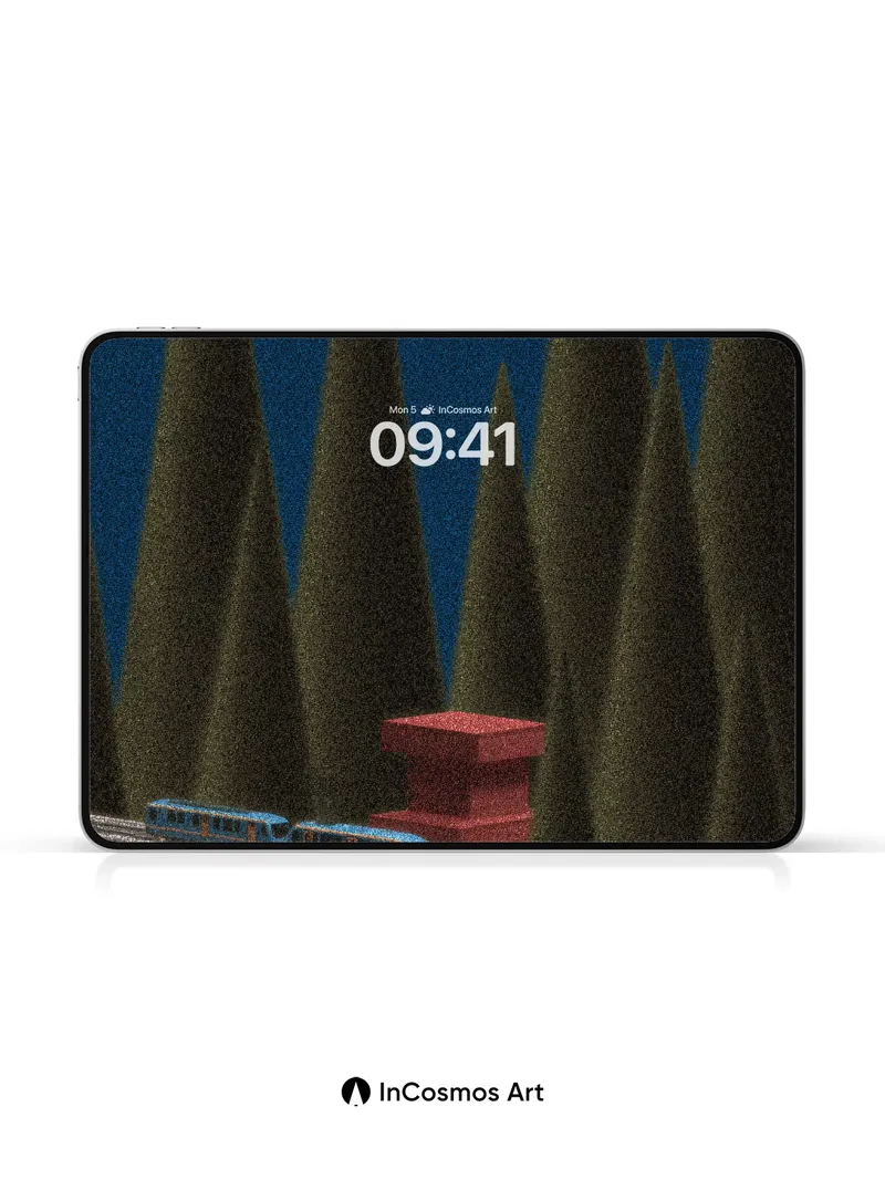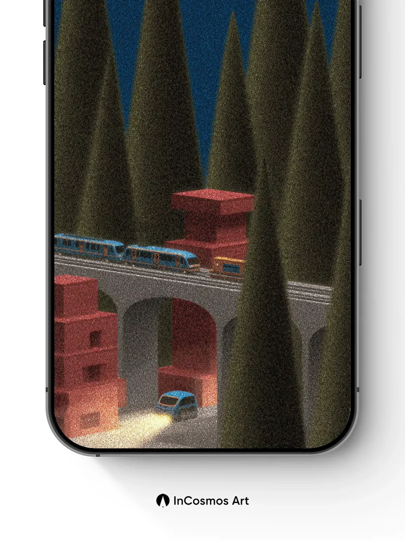 Debug product.metafields.custom.desc: Did you know that in some ancient cultures, trains were believed to carry souls between worlds? Here, a blue tram glides across a stone viaduct beneath towering evergreens, its light slicing through the velvet dark like a whispered secret. Below, a lone car emerges from shadow, headlights painting a path through silence—each tree a sentinel, each curve of track a promise of unseen destinations.