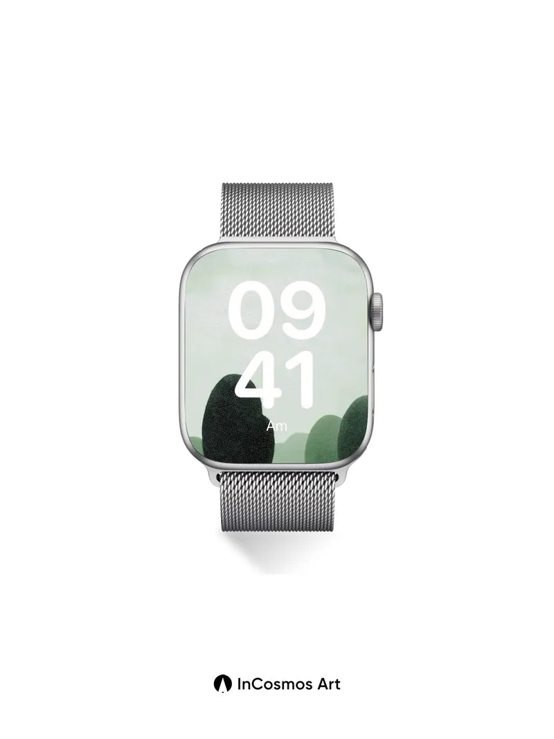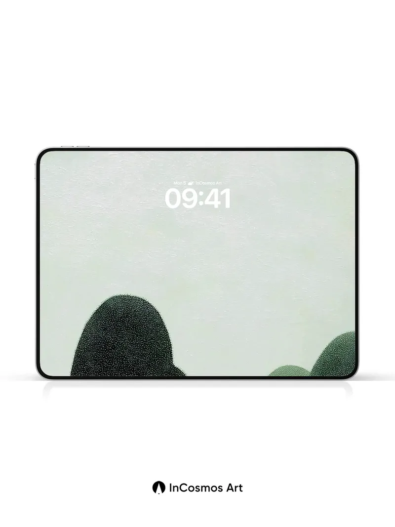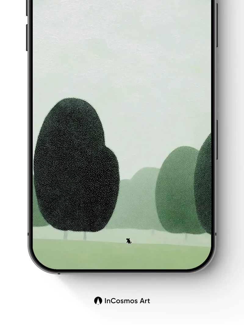 Debug product.metafields.custom.desc: Did you know that in Japanese art, a single figure under vast nature symbolizes the soul’s quiet communion with the world? Here, a tiny silhouette stands before towering, ink-wash trees that rise like breath held in stillness, their forms softened by a hazy green sky where light barely stirs. The ground glows with a pale emerald hum, as if the earth itself is dreaming beneath a veil of fog.