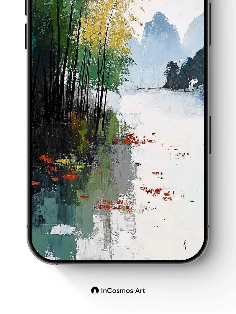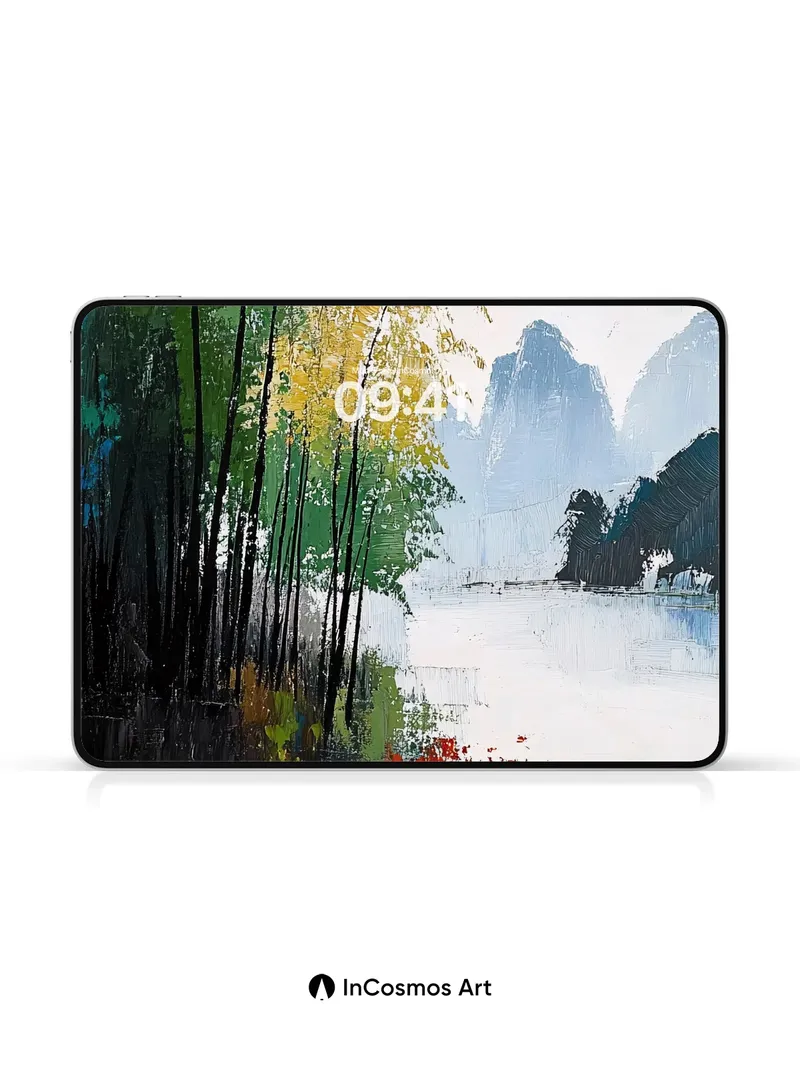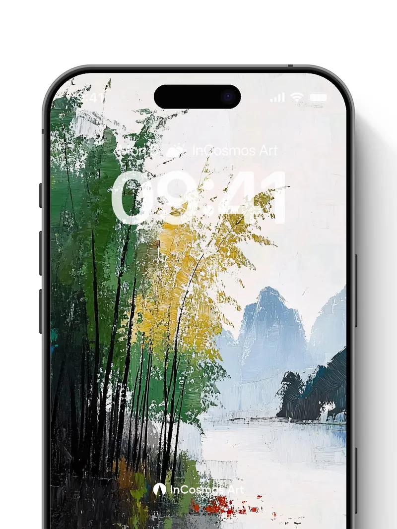Debug product.metafields.custom.desc: Did you know that in traditional Chinese gardens, bamboo is planted to absorb negative energy? Here, its slender stems rise like silent sentinels through a fog-draped riverbank, their reflections shimmering in the still water. Crimson lotus petals float like embers on the surface, glowing against the cool silver of the mist, while distant karst peaks fade into the sky like dreams half-remembered.