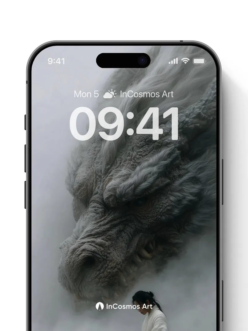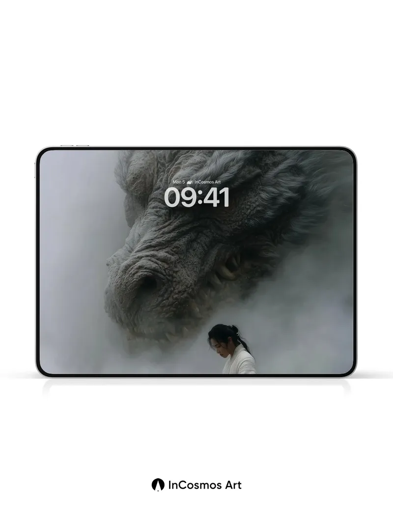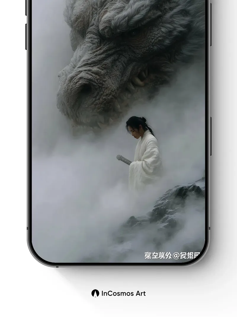 Did you know ancient Chinese myths describe dragons as mist-born spirits that shape the mountains? Here, a colossal serpentine head emerges from swirling vapor, its scales like weathered stone and eyes glowing with quiet wisdom. Below, a lone figure in white robes stands poised, sword at rest, as if time itself holds its breath. The fog clings to every ridge and fold, breathing life into the scene like an old tale waking from slumber.