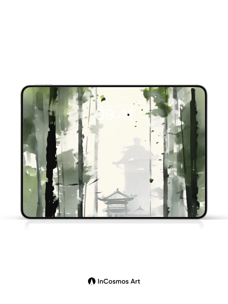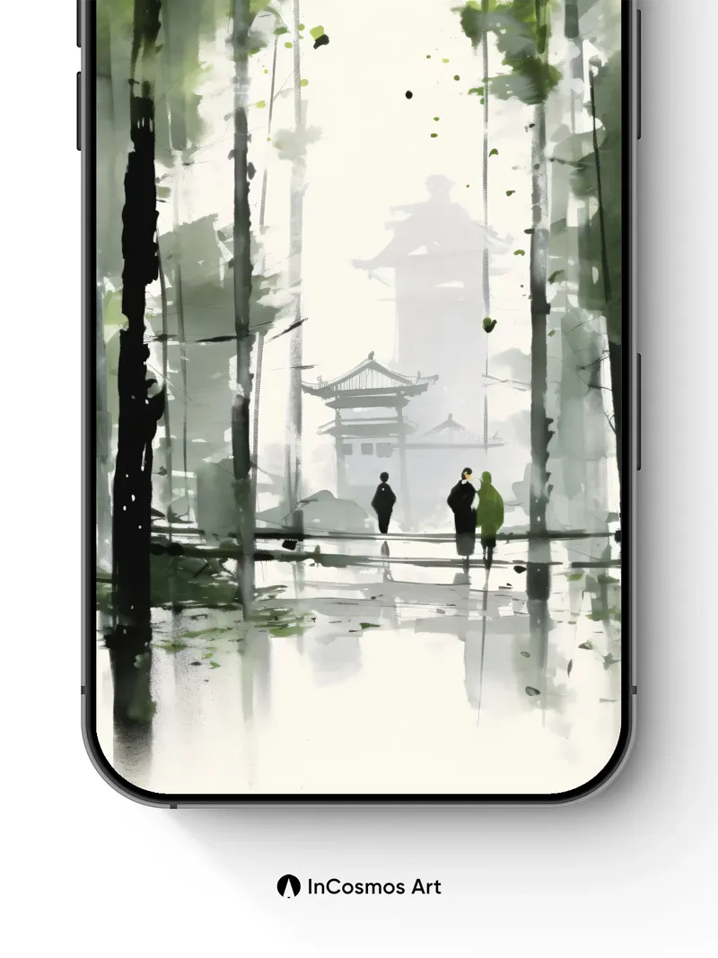 Misty Bamboo Grove Wallpaper with Floating Pagoda