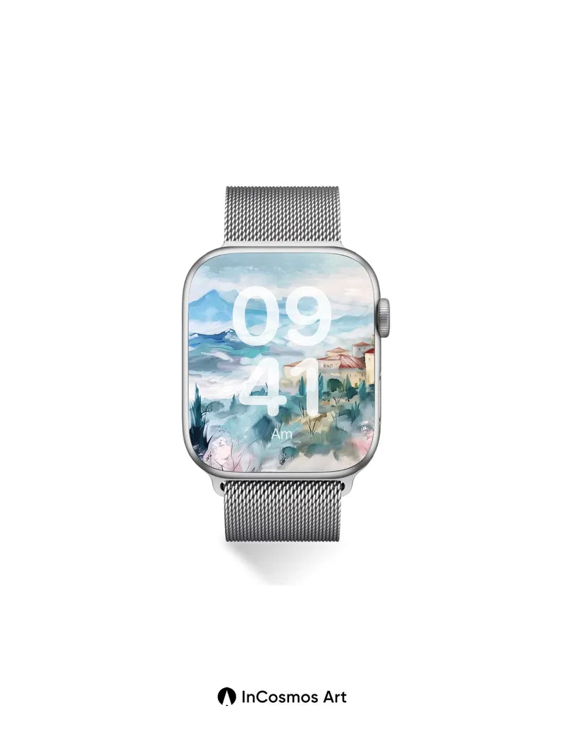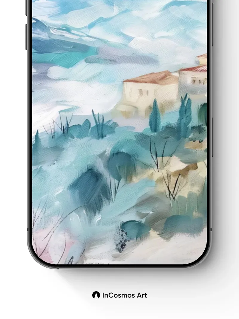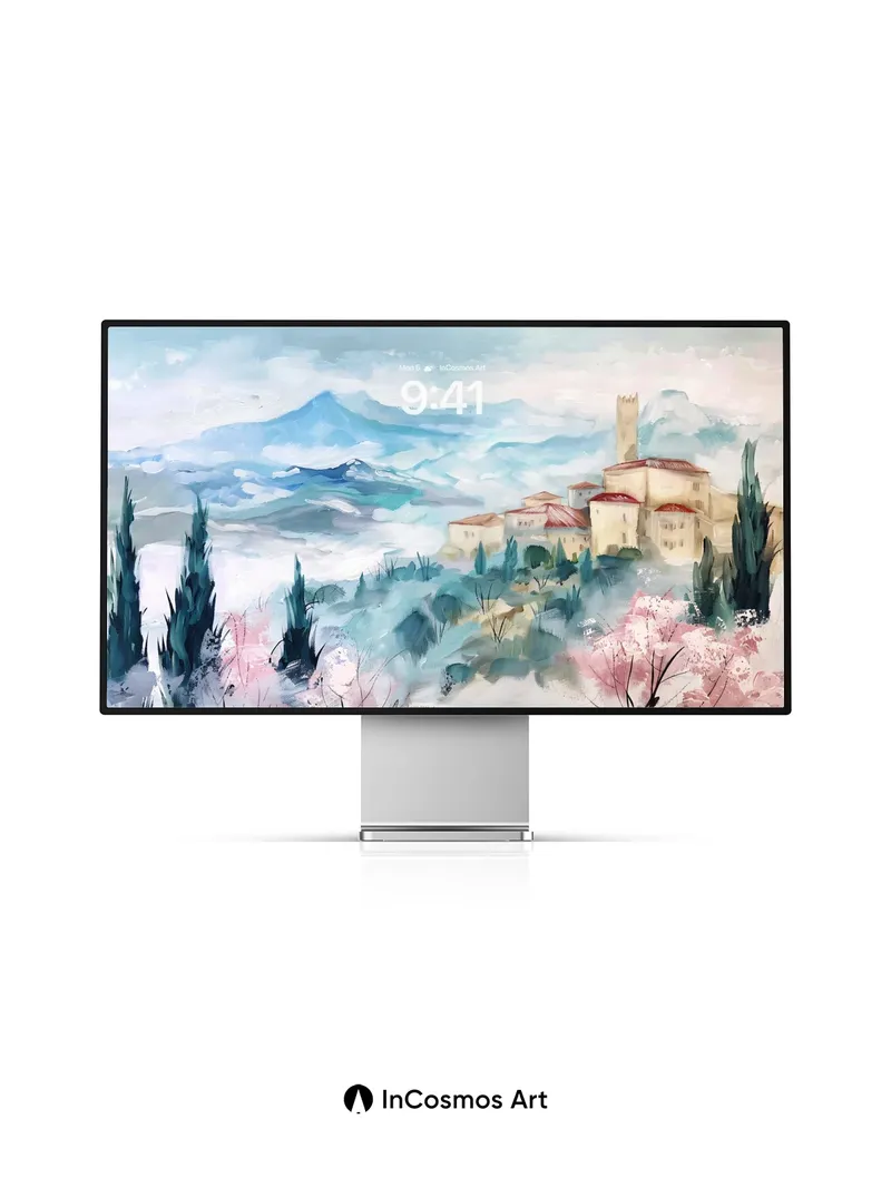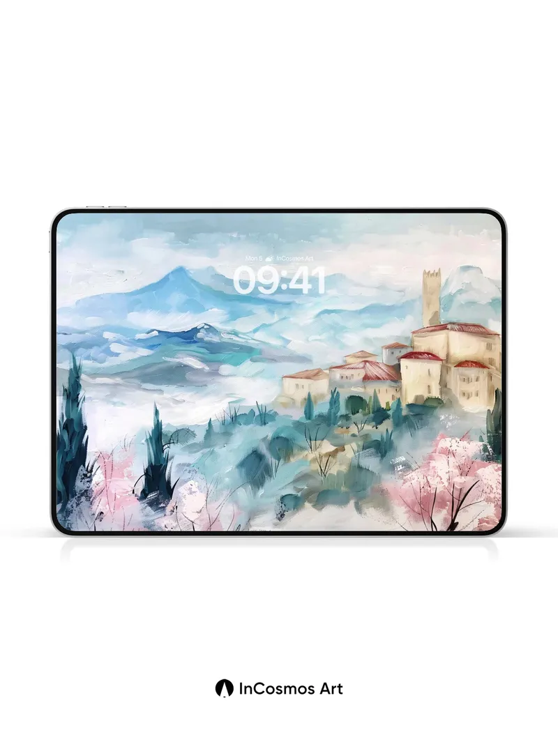 Debug page_description: Did you know that ancient Mediterranean settlements were often built on hills to harness morning mist as a natural cooling system? Here, soft watercolor light crawls over terracotta roofs and cypress trees like breath across still air. The distant mountain looms in hazy blue, while cherry blossoms bleed into the valley below—each brushstroke a quiet memory of time suspended. Share this with your best friend. Send this to your love and swap a matching set. What if every morning began with a view like this?