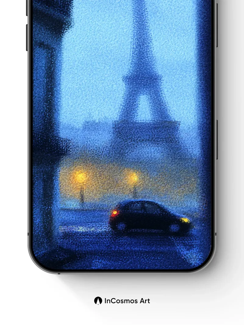 Debug product.metafields.custom.desc: Did you know Paris’s fog often carries the scent of old books and iron? The Eiffel Tower stands like a ghost in twilight, its silhouette softened by rain that crawls across wet cobblestones, while a lone car glows with amber tail lights beneath a sky that breathes in cool indigo. You’re not just seeing a city—you’re stepping into a moment suspended between memory and dream.