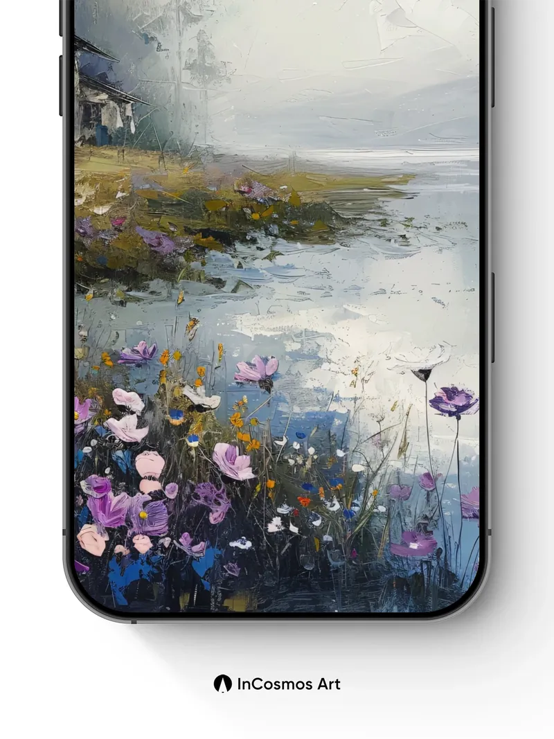 Debug page_description: Did you know that certain wildflowers bloom only when touched by morning mist? Here, they rise like silent prayers along the water’s edge, their petals brushing against a lake that mirrors the sky in soft, hazy strokes. The old cottage watches from the shore, its weathered walls breathing quiet stories into the fog, while color slips through the air like silk woven by dawn. Share this with your best friend. Send this to your love and swap a matching set. What if every flower held a memory of someone who once stood here?