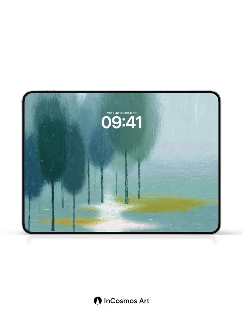 Misty Pathway Wallpaper with Soft Tree Silhouettes