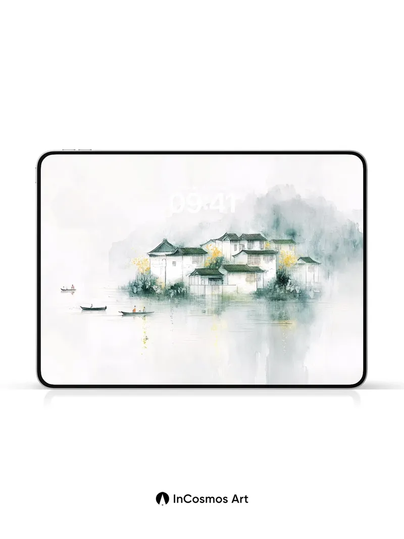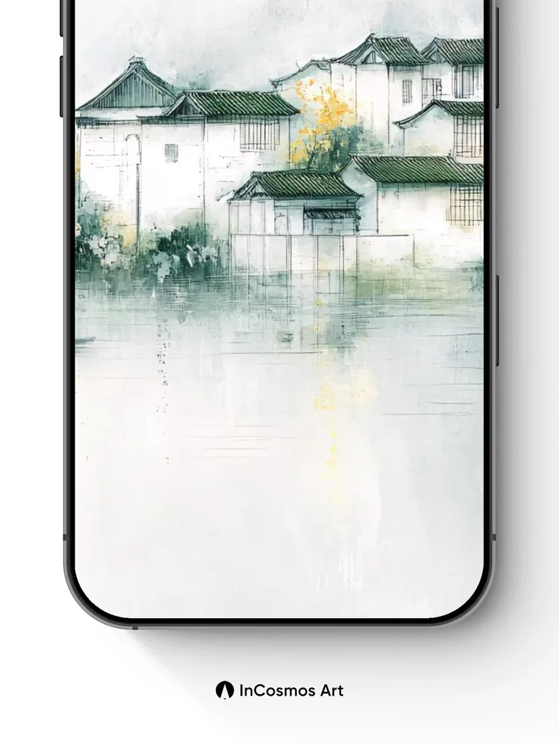 Debug page_description: Did you know traditional Chinese ink wash paintings were once used to meditate on balance and harmony? Here, soft gray mist crawls over water like a breath held too long, while white-walled houses float in quiet suspension—reflections so perfect they seem to breathe beneath the surface. You’re not just looking at a scene; you’re stepping into a moment where time slows and stillness becomes a language. Share this with your best friend. Send this to your love and swap a matching set. What would you whisper if the water could answer?