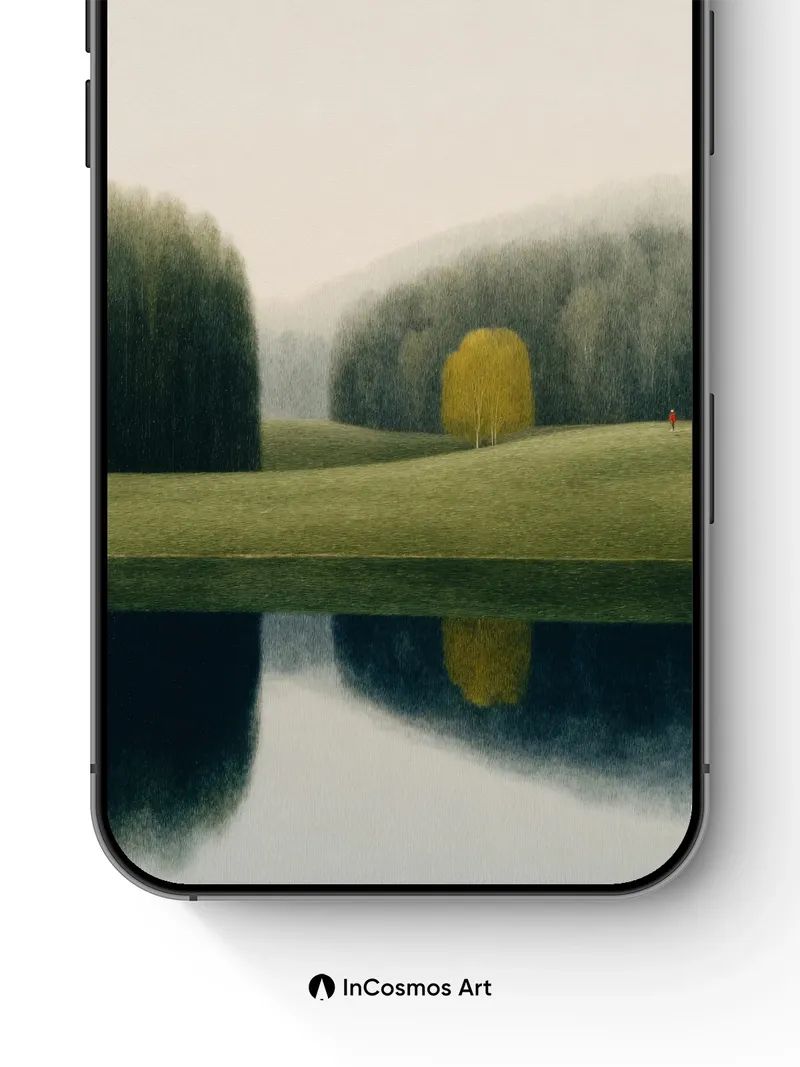 Misty Solitude Wallpaper with Golden Tree Reflection