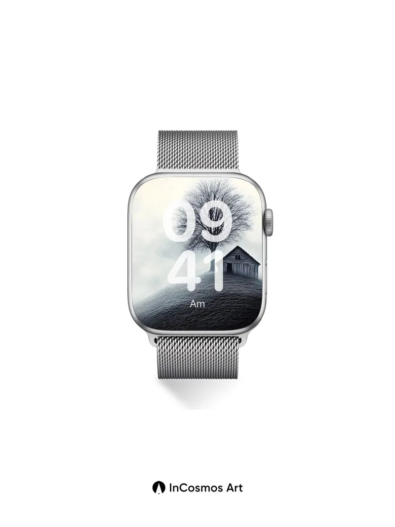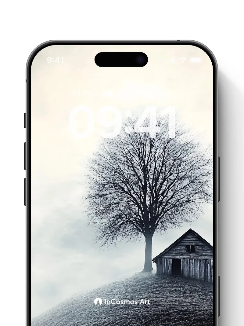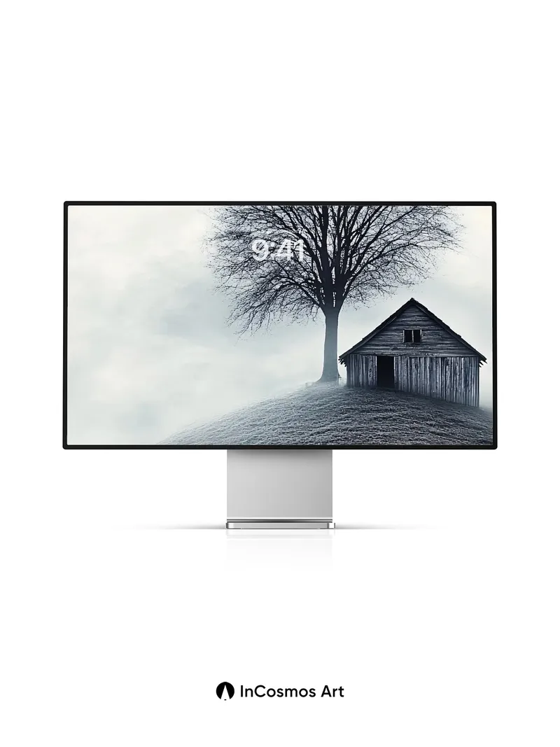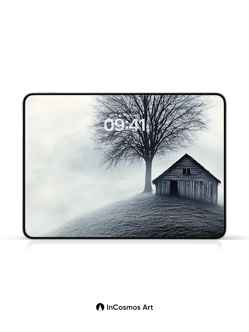 Debug product.metafields.custom.desc: Did you know that fog can hold the memory of sound, making silence feel heavier? A lone barn and bare tree stand atop a hill where frost clings like old secrets, their silhouettes carved into the mist as if time itself paused to breathe. The air feels thick with stillness, each blade of grass etched in silver under a sky that never quite decides between dawn and dusk.
