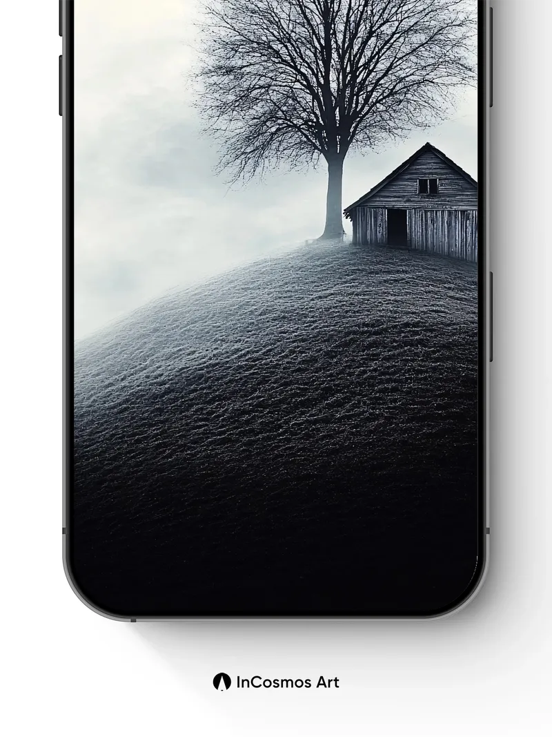 Debug page_description: Did you know that fog can hold the memory of sound, making silence feel heavier? A lone barn and bare tree stand atop a hill where frost clings like old secrets, their silhouettes carved into the mist as if time itself paused to breathe. The air feels thick with stillness, each blade of grass etched in silver under a sky that never quite decides between dawn and dusk. Share this with your best friend. Send this to your love and swap a matching set. What if the house remembers names it never knew?