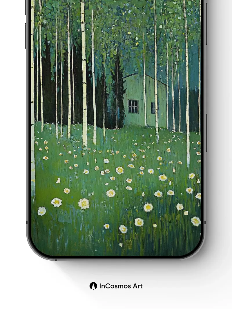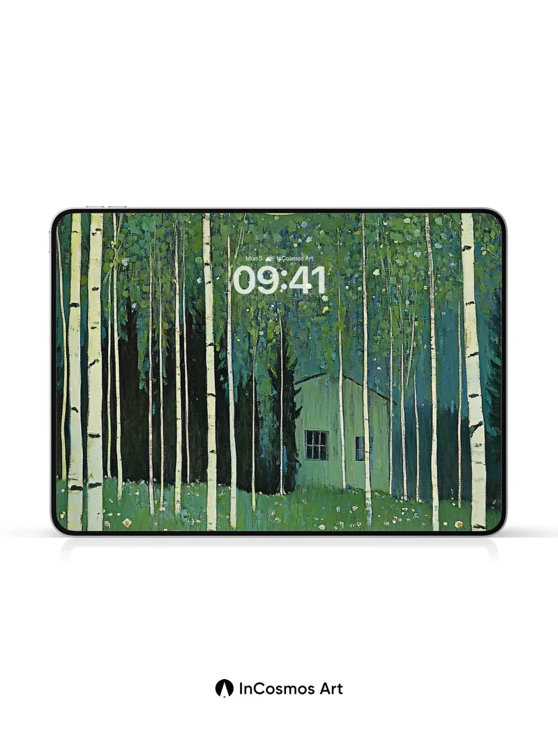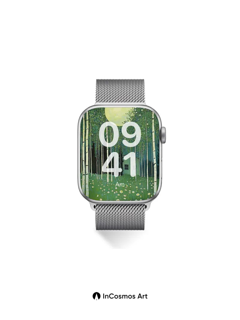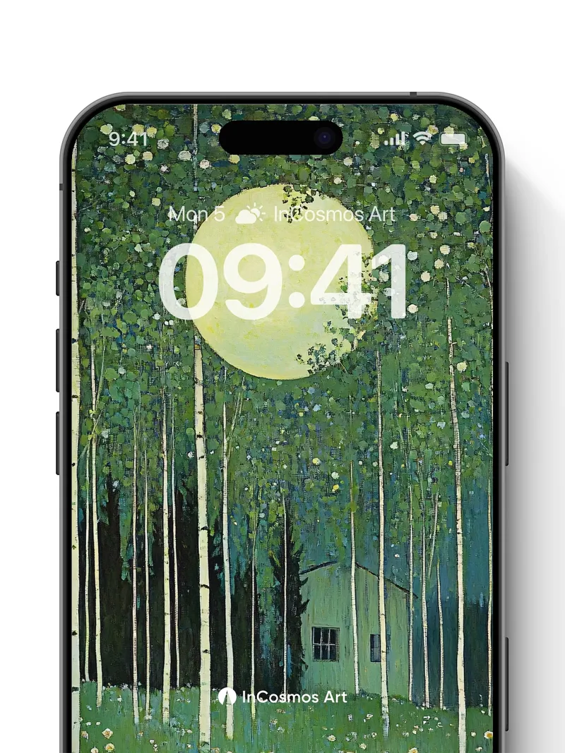 Moonlit Birch Forest Wallpaper with Hidden Cottage