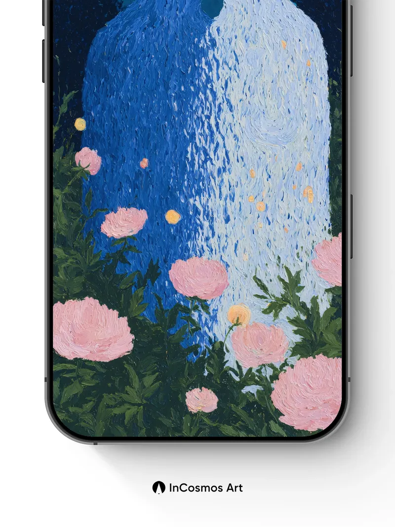 Did you know that the color indigo was once reserved for royalty in ancient civilizations? Here, two silhouetted forms stand under a golden moon, their bodies woven from textured strokes of deep blue and luminous white, as if painted by the wind itself. Pink peonies bloom at their feet, each petal thick with pigment like crushed velvet, while shadows breathe through the trees behind them.