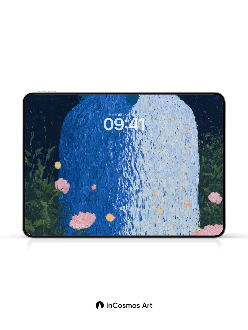 Debug product.metafields.custom.desc: Did you know that the color indigo was once reserved for royalty in ancient civilizations? Here, two silhouetted forms stand under a golden moon, their bodies woven from textured strokes of deep blue and luminous white, as if painted by the wind itself. Pink peonies bloom at their feet, each petal thick with pigment like crushed velvet, while shadows breathe through the trees behind them.