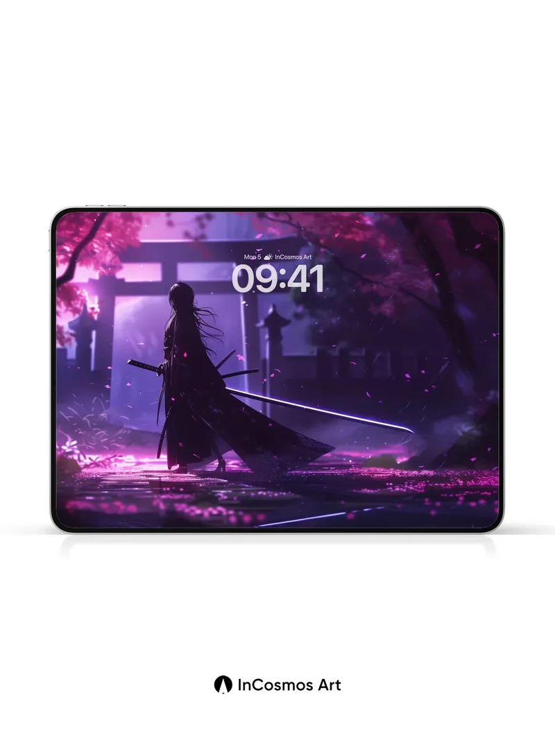 Debug product.metafields.custom.desc: Did you know cherry blossoms in Japan are believed to carry the souls of ancestors? Here, a lone figure stands beneath a torii gate as petals fall like embers from a silent fire, their glow painting the ground in hues of amethyst and twilight. The sword at their side hums with unspoken vows, its edge reflecting not light, but memory—each petal a whisper of what was, and what might be.