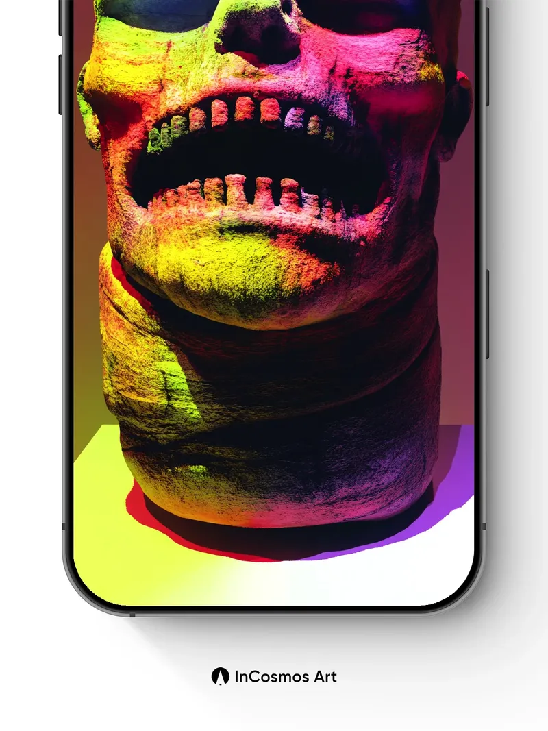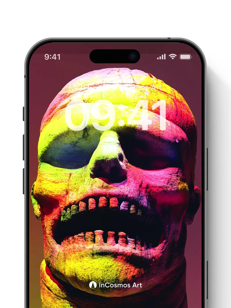 Debug product.metafields.custom.desc: Did you know ancient Egyptian mummies were sometimes wrapped in linen dyed with mineral pigments that shifted color over time? Here, light crawls over the cracked surface like living electricity, breathing vibrant hues into fossilized skin. The skull’s open mouth whispers secrets from beyond time, its teeth glowing like neon fossils beneath a surreal rainbow shroud.