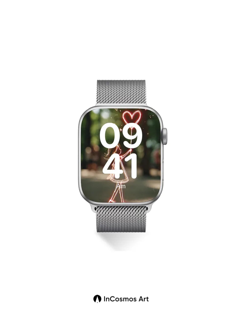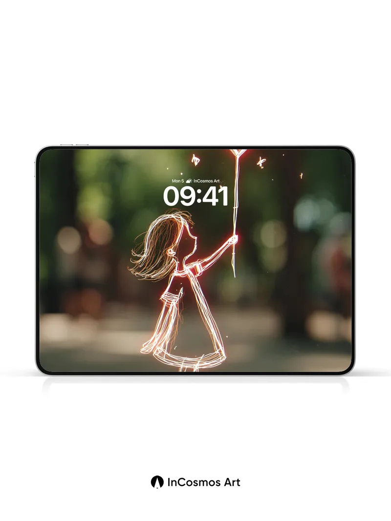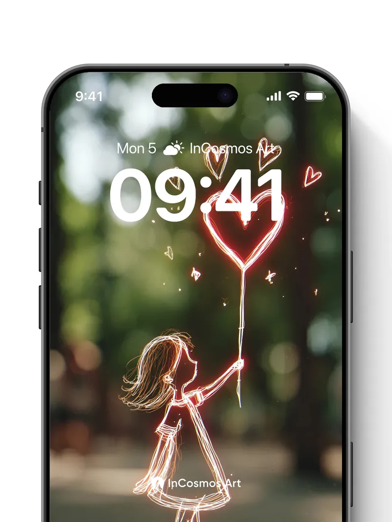 Debug product.metafields.custom.desc: Did you know light can trace the shape of a child’s joy? Here, a glowing outline walks through dappled sunlight, holding a heart-shaped balloon that pulses like a living ember. Tiny hearts float upward, each one flickering as if breathing in rhythm with the quiet forest behind. The ground beneath her feet casts a soft shadow—real, yet fragile—as if this moment is both memory and dream.