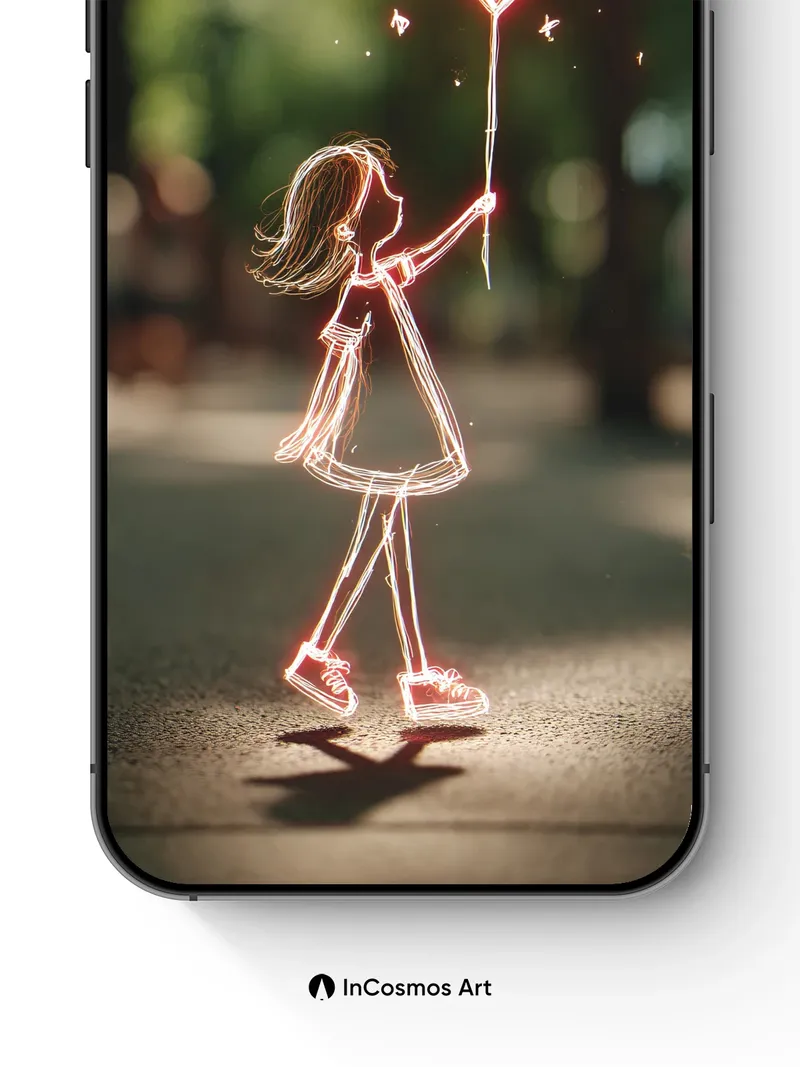 Debug page_description: Did you know light can trace the shape of a child’s joy? Here, a glowing outline walks through dappled sunlight, holding a heart-shaped balloon that pulses like a living ember. Tiny hearts float upward, each one flickering as if breathing in rhythm with the quiet forest behind. The ground beneath her feet casts a soft shadow—real, yet fragile—as if this moment is both memory and dream. Share this with your best friend. Send this to your love and swap a matching set. Could a drawing ever hold more truth than a photograph?