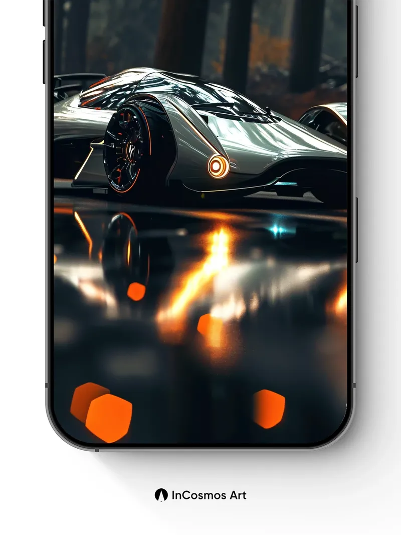 Did you know that wet asphalt can mirror the sky like a liquid lens? Here, a sleek silver hypercar hovers above a rain-slicked forest floor where firelight dances in fractured gold. The car’s chrome skin breathes light, its glowing eyes piercing through misty pines as if time itself has paused to watch it glide. You feel the cool dampness of the air, the hum of silent engines, and the quiet awe of something too perfect to be real.