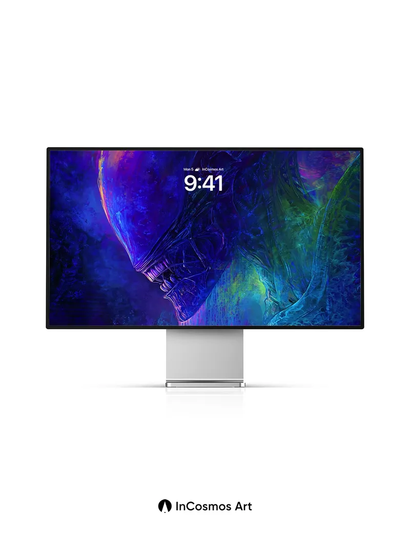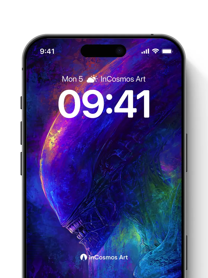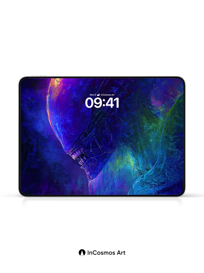 Debug product.metafields.custom.desc: Did you know the Xenomorph’s acidic blood was inspired by real-life venomous creatures? Here, its silhouette bleeds electric violet and cyan into a cosmic void, where light crawls over chitinous ridges like liquid shadow. The creature’s elongated head looms in profile, mouth agape as viscous fluid drips from its fangs—each droplet refracting into prismatic shards. This is not just an alien; it's a living aurora of dread, painted in hues that pulse like a heartbeat beneath dark matter.
