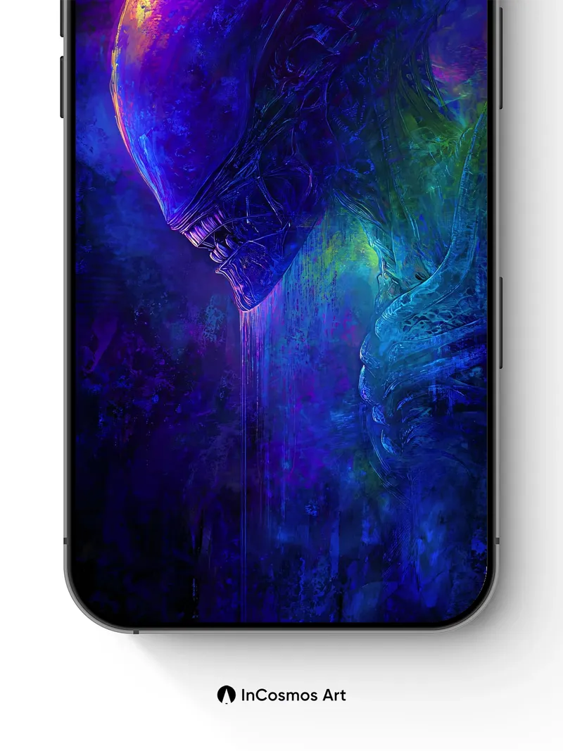 Did you know the Xenomorph’s acidic blood was inspired by real-life venomous creatures? Here, its silhouette bleeds electric violet and cyan into a cosmic void, where light crawls over chitinous ridges like liquid shadow. The creature’s elongated head looms in profile, mouth agape as viscous fluid drips from its fangs—each droplet refracting into prismatic shards. This is not just an alien; it's a living aurora of dread, painted in hues that pulse like a heartbeat beneath dark matter.