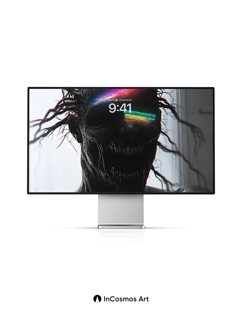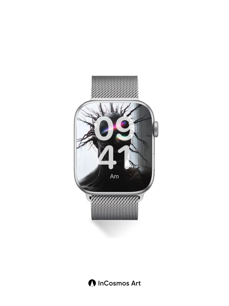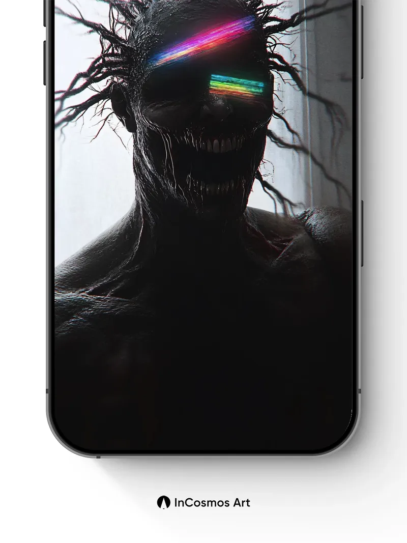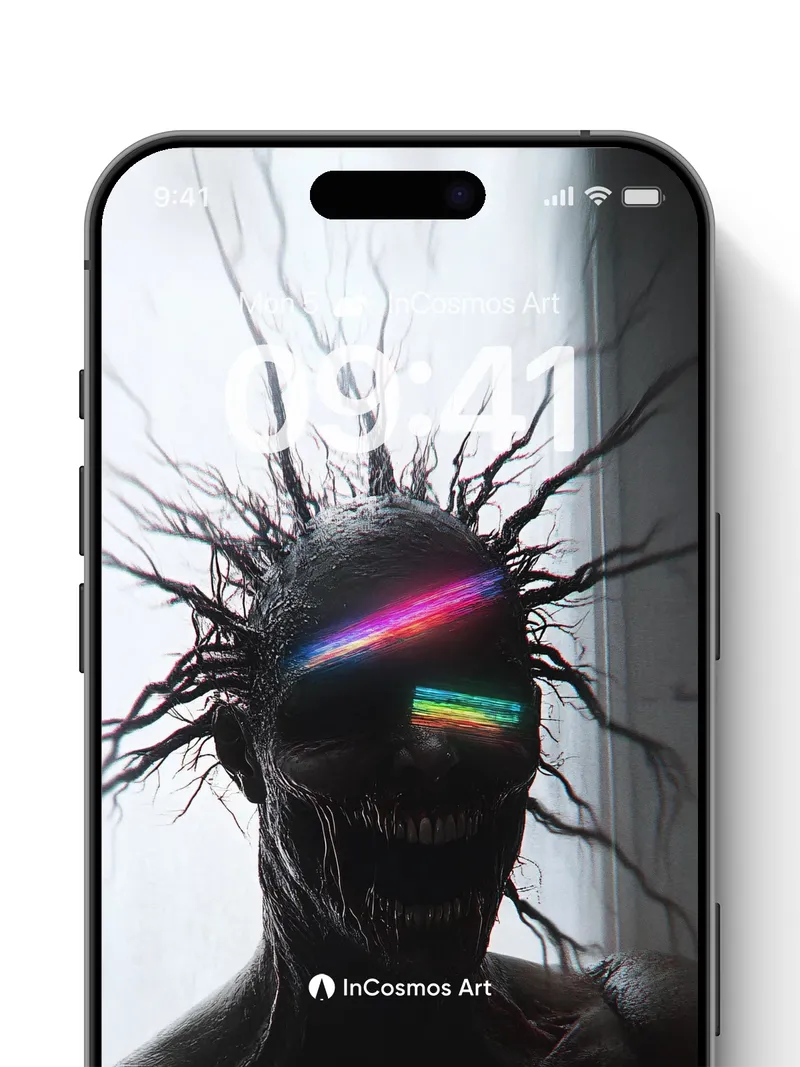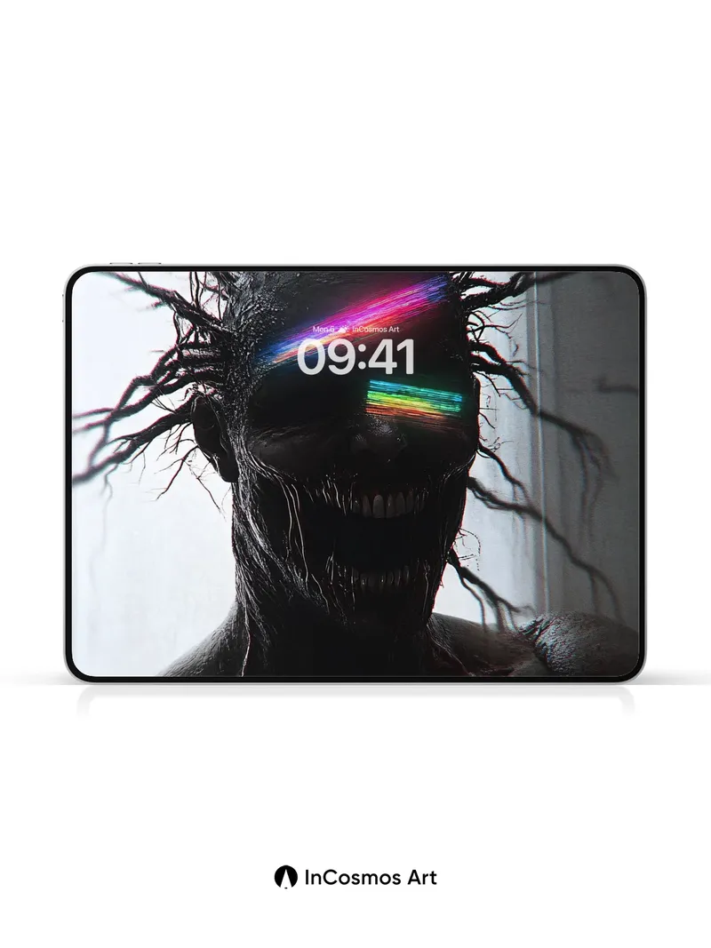 Debug product.metafields.custom.desc: Did you know that certain deep-sea creatures emit bioluminescent light to navigate darkness? Here, a spectral figure emerges from shadow, its face carved by jagged tendrils like living wires, pulsing with rainbow fractures across hollow eyes. Light crawls over its obsidian skin, not as illumination but as a wound—neon veins bleeding color into the void. This is not a portrait of fear, but of transformation: where technology bleeds into myth, and silence hums with electric breath.