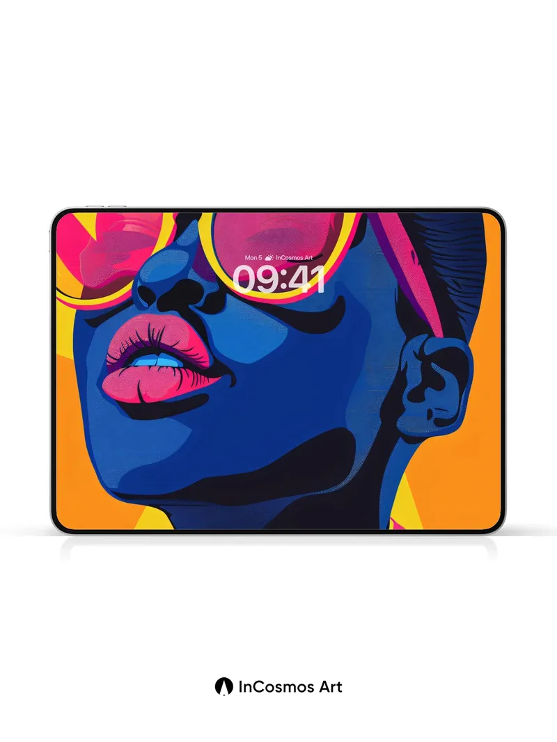 Debug page_description: Did you know that pop art emerged in the 1950s as a rebellion against elitist fine art, using mass culture imagery to challenge norms? Here, vibrant color fields and sharp contrasts breathe life into a stylized portrait, where light crawls over smooth surfaces like electric current. The bold yellow frame and magenta lenses reflect a world unbound by gravity—where identity is both mask and revelation. Share this with your best friend. Send this to your love and swap a matching set. What if every glance could rewrite reality?