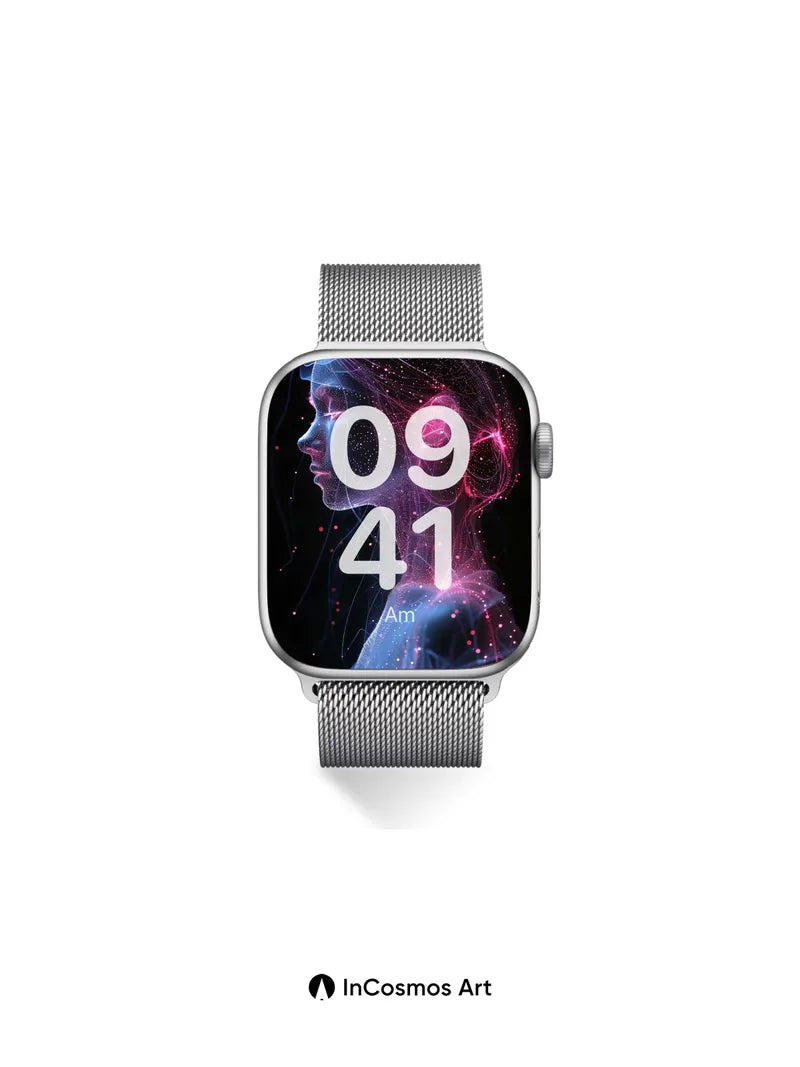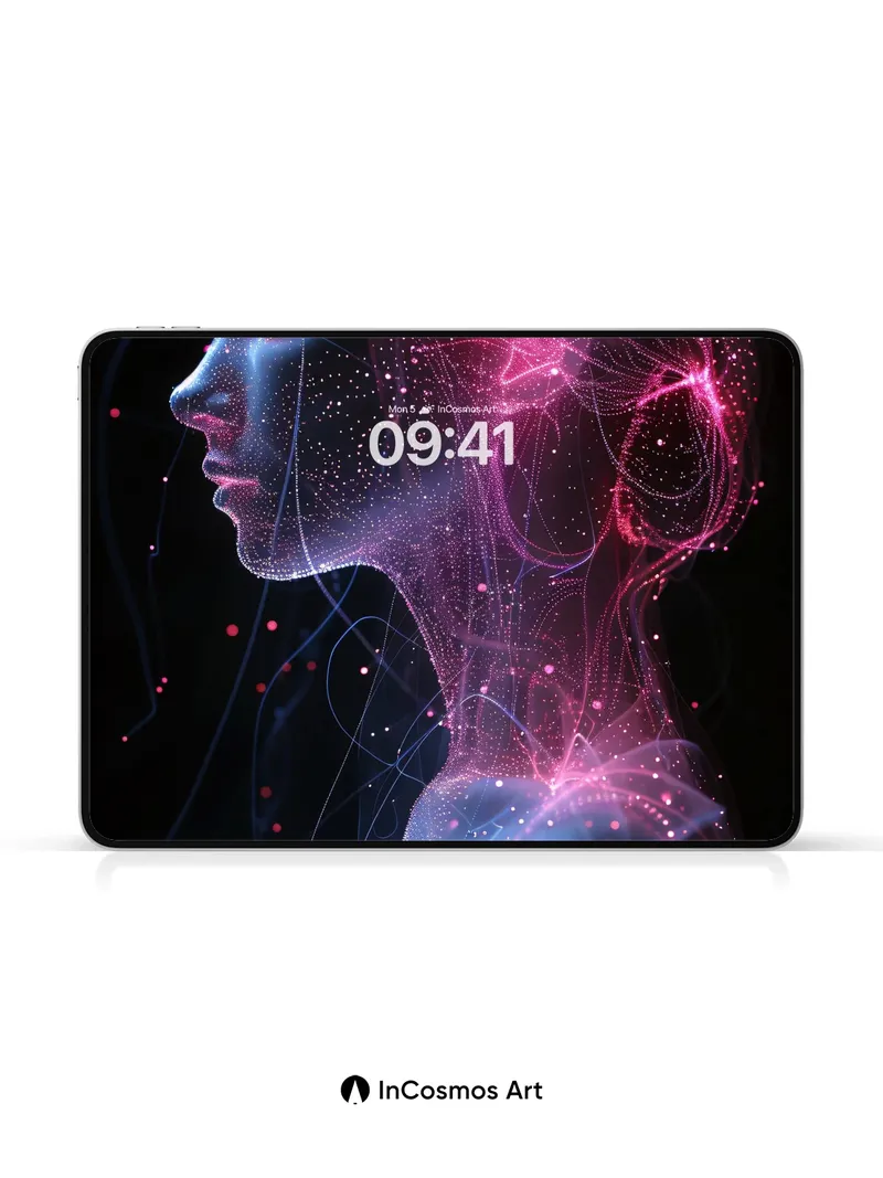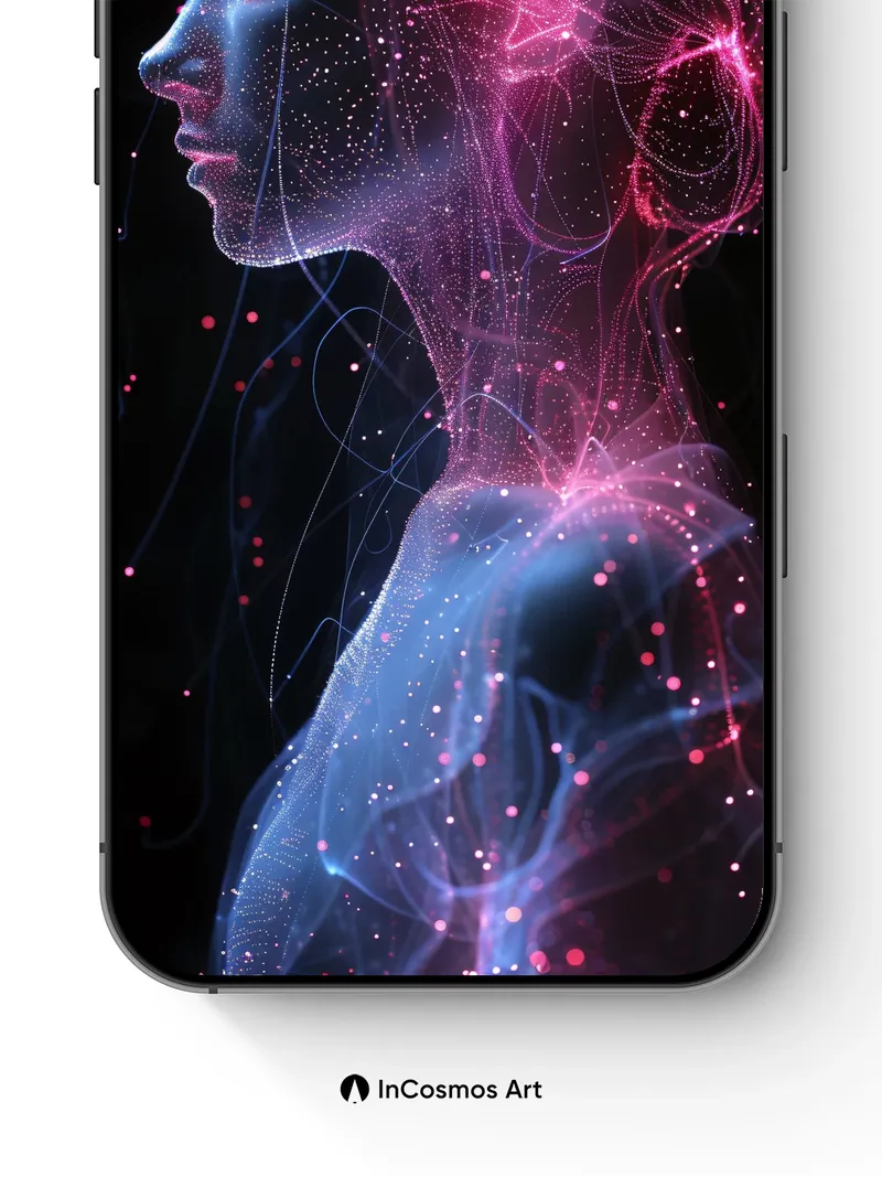 Debug page_description: Did you know that bioluminescent organisms emit light through chemical reactions in their cells? Here, light breathes through a digital veil of shimmering particles, tracing the silhouette of a woman whose form dissolves into cosmic threads. Her skin glows like a nebula caught in stillness, each dot pulsing as if alive, weaving a quiet symphony between science and soul. Share this with your best friend. Send this to your love and swap a matching set. What if your dreams were made of data?