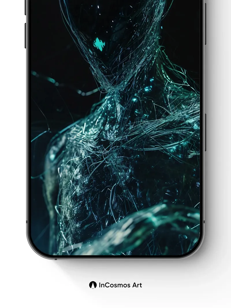 Did you know that bioluminescent organisms can emit light through chemical reactions in their cells? Here, the same phenomenon pulses through a translucent humanoid form, where electric veins crawl over glass-like skin and shimmering filaments drift like underwater kelp. You’re not looking at a being—you’re witnessing an idea made visible, breathing in the dark.
