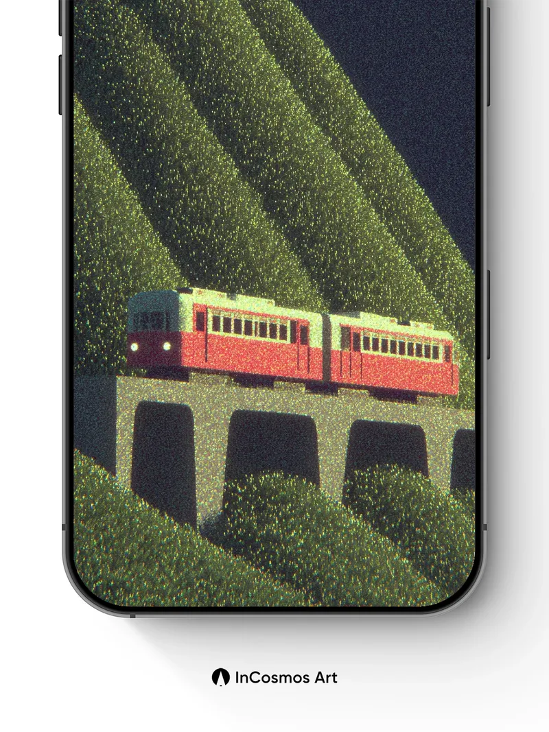 Debug page_description: Did you know that the first electric trains ran on tracks built over stone arches like this one, echoing through time? A crimson train glides across a concrete viaduct, its headlights piercing the velvet dark as it cuts through a forest of pixelated green hills—each blade of grass a tiny light, breathing in the stillness. The night holds its breath, and you’re not just watching—it’s as if the world is whispering secrets from the rails. Share this with your best friend. Send this to your love and swap a matching set. What if every journey was a memory waiting to be remembered?