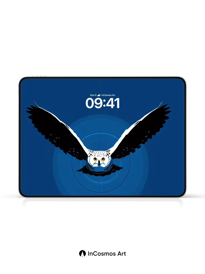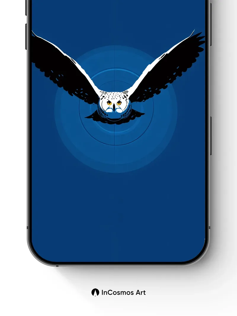 Debug page_description: Did you know snowy owls can rotate their heads nearly 270 degrees to track prey in total darkness? This image captures the owl mid-dive, wings spread like shadowed sails against a deep, velvety blue that breathes with concentric rings of light—each one a silent echo of its flight path. The eyes burn with golden fire, piercing through the calm as if time itself pauses to witness this moment of precision and grace. Share this with your best friend. Send this to your love and swap a matching set. What if every night held a creature watching you back?