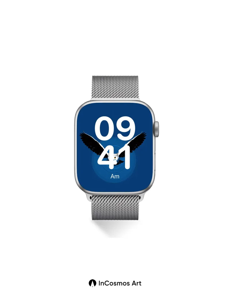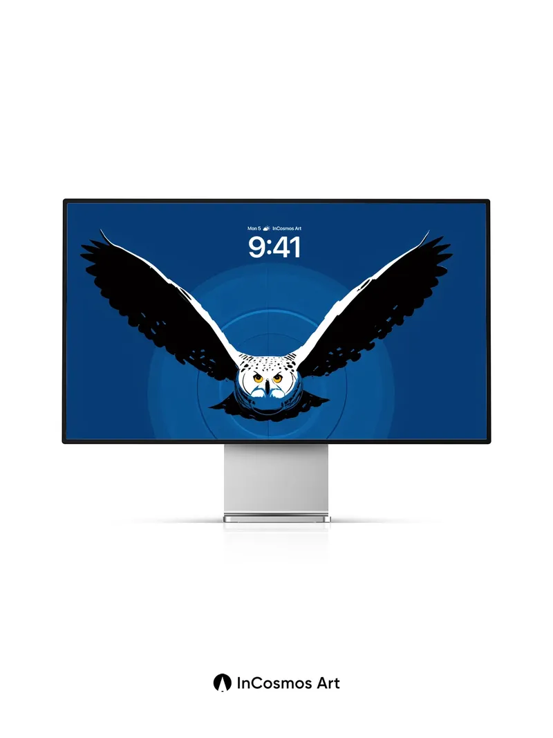 Debug product.metafields.custom.desc: Did you know snowy owls can rotate their heads nearly 270 degrees to track prey in total darkness? This image captures the owl mid-dive, wings spread like shadowed sails against a deep, velvety blue that breathes with concentric rings of light—each one a silent echo of its flight path. The eyes burn with golden fire, piercing through the calm as if time itself pauses to witness this moment of precision and grace.