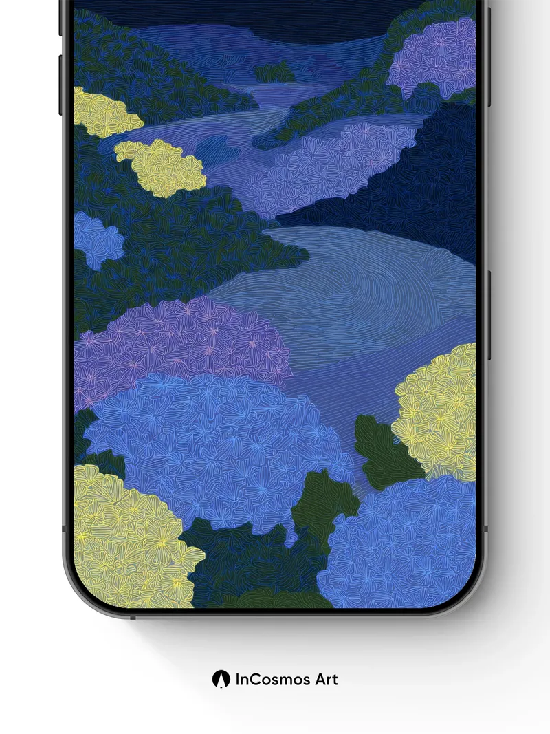 Debug page_description: Did you know that hydrangeas in Japan are often associated with heartfelt emotions and deep understanding? This scene breathes with intricate floral patterns stitched into a midnight landscape, where color pulses like slow-moving tides beneath a starless sky. The textures feel alive—each petal etched with tiny spirals that shimmer as if lit from within, inviting you to trace the quiet rhythm of nature’s secret language. Share this with your best friend. Send this to your love and swap a matching set. What if every night held a hidden garden only visible to those who pause?